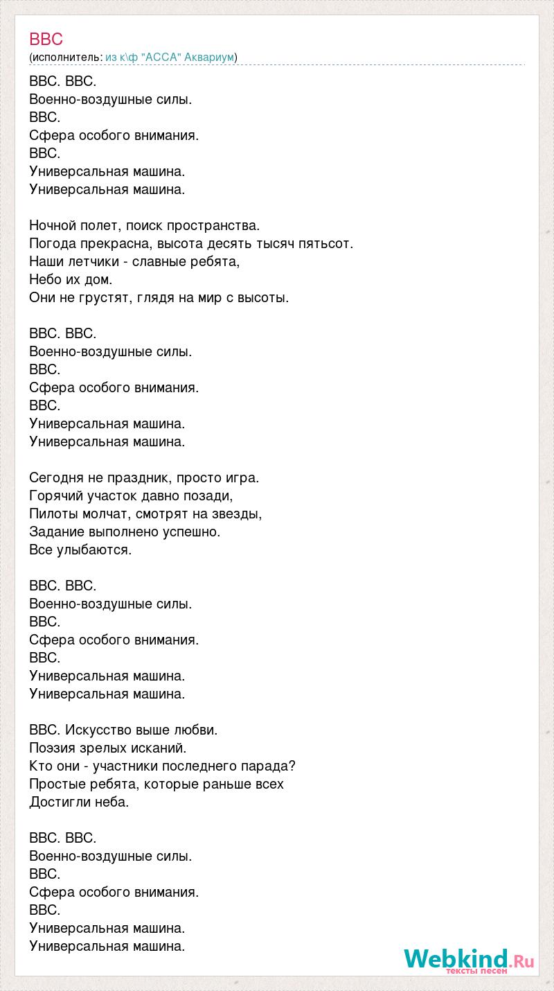 ВВС. ВВС. Военно-воздушные силы. ВВС. Сфера особого внимания. ВВС. Универсальная машина. Универсальная машина. Ночной полет, поиск пространства. Погода прекрасна, высота десять тысяч пятьсот. Наши летчики - славные ребята, Небо их дом. Они не грустят, глядя на мир с высоты. ВВС. ВВС. Военно-воздушные силы. ВВС. Сфера особого внимания. ВВС. Универсальная машина. Универсальная машина. Сегодня не праздник, просто игра. Горячий участок давно позади, Пилоты молчат, смотрят на звезды, Задание выполнено успешно. Все улыбаются. ВВС. ВВС. Военно-воздушные силы. ВВС. Сфера особого внимания. ВВС. Универсальная машина. Универсальная машина. ВВС. Искусство выше любви. Поэзия зрелых исканий. Кто они - участники последнего парада? Простые ребята, которые раньше всех Достигли неба. ВВС. ВВС. Военно-воздушные силы. ВВС. Сфера особого внимания. ВВС. Универсальная машина. Универсальная машина.
