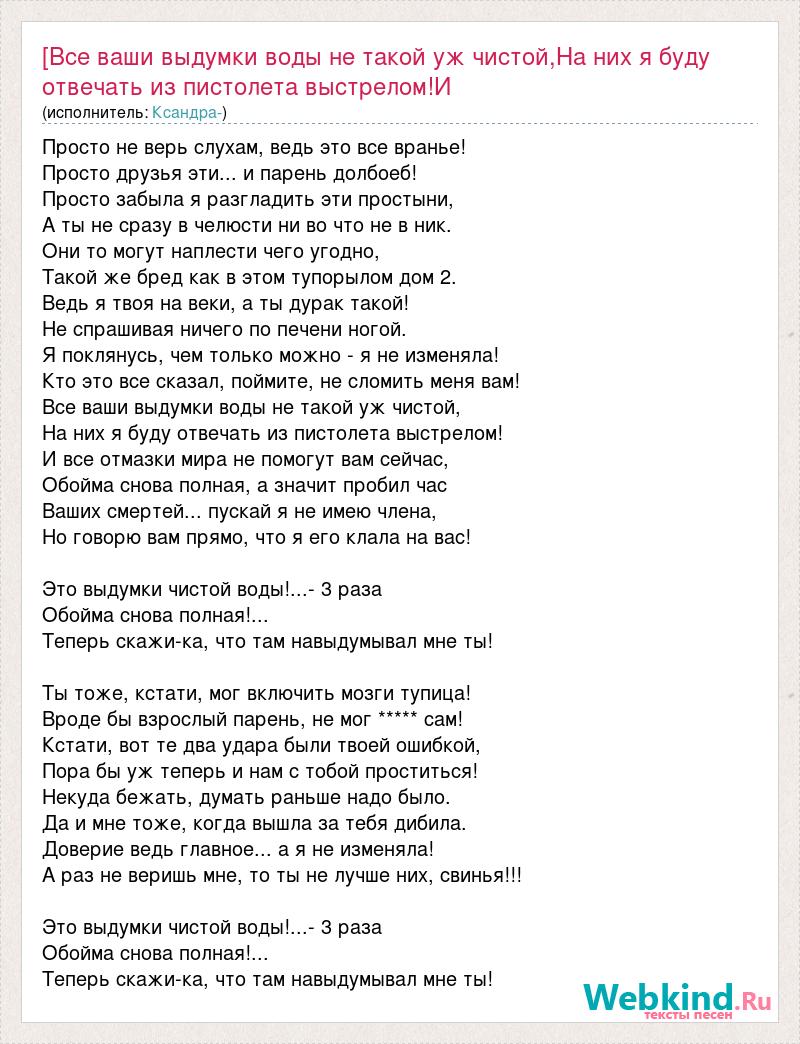 Просто не верь слухам, ведь это все вранье! Просто друзья эти... и парень долбоеб! Просто забыла я разгладить эти простыни, А ты не сразу в челюсти ни во что не в ник. Они то могут наплести чего угодно, Такой же бред как в этом тупорылом дом 2. Ведь я твоя на веки, а ты дурак такой! Не спрашивая ничего по печени ногой. Я поклянусь, чем только можно - я не изменяла! Кто это все сказал, поймите, не сломить меня вам! Все ваши выдумки воды не такой уж чистой, На них я буду отвечать из пистолета выстрелом! И все отмазки мира не помогут вам сейчас, Обойма снова полная, а значит пробил час Ваших смертей... пускай я не имею члена, Но говорю вам прямо, что я его клала на вас! Это выдумки чистой воды!...- 3 раза Обойма снова полная!... Теперь скажи-ка, что там навыдумывал мне ты! Ты тоже, кстати, мог включить мозги тупица! Вроде бы взрослый парень, не мог ***** сам! Кстати, вот те два удара были твоей ошибкой, Пора бы уж теперь и нам с тобой проститься! Некуда бежать, думать раньше надо было. Да и мне тоже, когда вышла за тебя дибила. Доверие ведь главное... а я не изменяла! А раз не веришь мне, то ты не лучше них, свинья!!! Это выдумки чистой воды!...- 3 раза Обойма снова полная!... Теперь скажи-ка, что там навыдумывал мне ты!