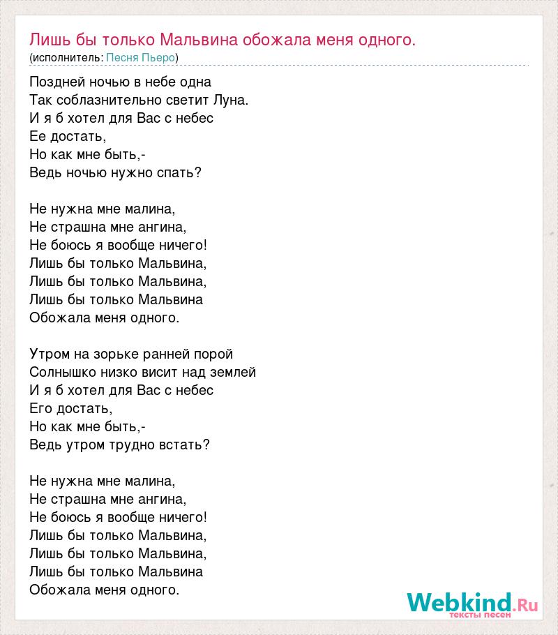 Поздней ночью в небе одна Так соблазнительно светит Луна. И я б хотел для Вас с небес Ее достать, Но как мне быть,- Ведь ночью нужно спать? Не нужна мне малина, Не страшна мне ангина, Не боюсь я вообще ничего! Лишь бы только Мальвина, Лишь бы только Мальвина, Лишь бы только Мальвина Обожала меня одного. Утром на зорьке ранней порой Солнышко низко висит над землей И я б хотел для Вас с небес Его достать, Но как мне быть,- Ведь утром трудно встать? Не нужна мне малина, Не страшна мне ангина, Не боюсь я вообще ничего! Лишь бы только Мальвина, Лишь бы только Мальвина, Лишь бы только Мальвина Обожала меня одного.