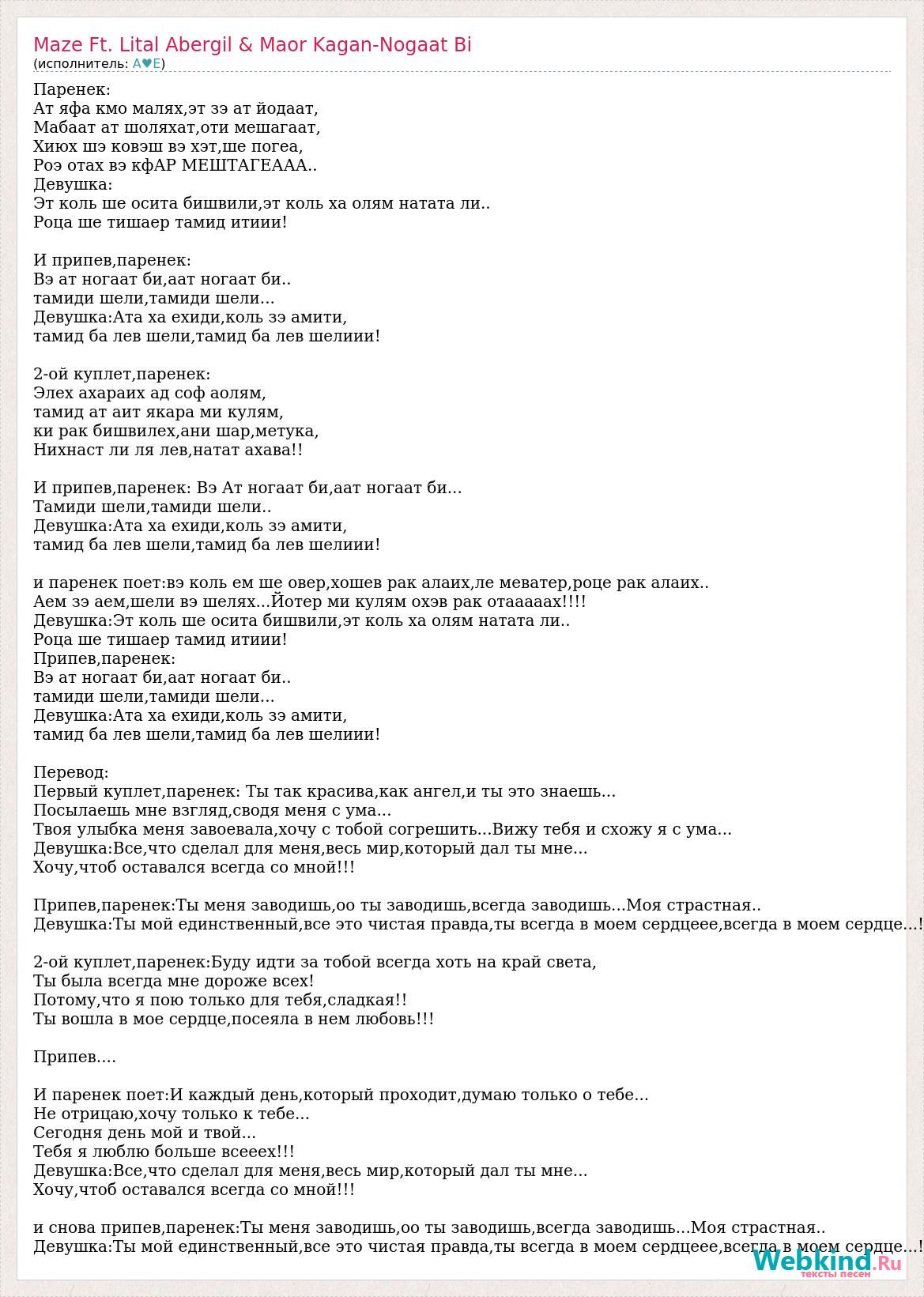 Паренек: Ат яфа кмо малях,эт зэ ат йодаат, Мабаат ат шоляхат,оти мешагаат, Хиюх шэ ковэш вэ хэт,ше погеа, Роэ отах вэ кфАР МЕШТАГЕААА.. Девушка: Эт коль ше осита бишвили,эт коль ха олям натата ли.. Роца ше тишаер тамид итиии! И припев,паренек: Вэ ат ногаат би,аат ногаат би.. тамиди шели,тамиди шели... Девушка:Ата ха ехиди,коль зэ амити, тамид ба лев шели,тамид ба лев шелиии! 2-ой куплет,паренек: Элех ахараих ад соф аолям, тамид ат аит якара ми кулям, ки рак бишвилех,ани шар,метука, Нихнаст ли ля лев,натат ахава!! И припев,паренек: Вэ Ат ногаат би,аат ногаат би... Тамиди шели,тамиди шели.. Девушка:Ата ха ехиди,коль зэ амити, тамид ба лев шели,тамид ба лев шелиии! и паренек поет:вэ коль ем ше овер,хошев рак алаих,ле меватер,роце рак алаих.. Аем зэ аем,шели вэ шелях...Йотер ми кулям охэв рак отааааах!!!! Девушка:Эт коль ше осита бишвили,эт коль ха олям натата ли.. Роца ше тишаер тамид итиии! Припев,паренек: Вэ ат ногаат би,аат ногаат би.. тамиди шели,тамиди шели... Девушка:Ата ха ехиди,коль зэ амити, тамид ба лев шели,тамид ба лев шелиии! Перевод: Первый куплет,паренек: Ты так красива,как ангел,и ты это знаешь... Посылаешь мне взгляд,сводя меня с ума... Твоя улыбка меня завоевала,хочу с тобой согрешить...Вижу тебя и схожу я с ума... Девушка:Все,что сделал для меня,весь мир,который дал ты мне... Хочу,чтоб оставался всегда со мной!!! Припев,паренек:Ты меня заводишь,оо ты заводишь,всегда заводишь...Моя страстная.. Девушка:Ты мой единственный,все это чистая правда,ты всегда в моем сердцеее,всегда в моем сердце...! 2-ой куплет,паренек:Буду идти за тобой всегда хоть на край света, Ты была всегда мне дороже всех! Потому,что я пою только для тебя,сладкая!! Ты вошла в мое сердце,посеяла в нем любовь!!! Припев.... И паренек поет:И каждый день,который проходит,думаю только о тебе... Не отрицаю,хочу только к тебе... Сегодня день мой и твой... Тебя я люблю больше всееех!!! Девушка:Все,что сделал для меня,весь мир,который дал ты мне... Хочу,чтоб оставался всегда со мной!!! и снова припев,паренек:Ты меня заводишь,оо ты заводишь,всегда заводишь...Моя страстная.. Девушка:Ты мой единственный,все это чистая правда,ты всегда в моем сердцеее,всегда в моем сердце...!