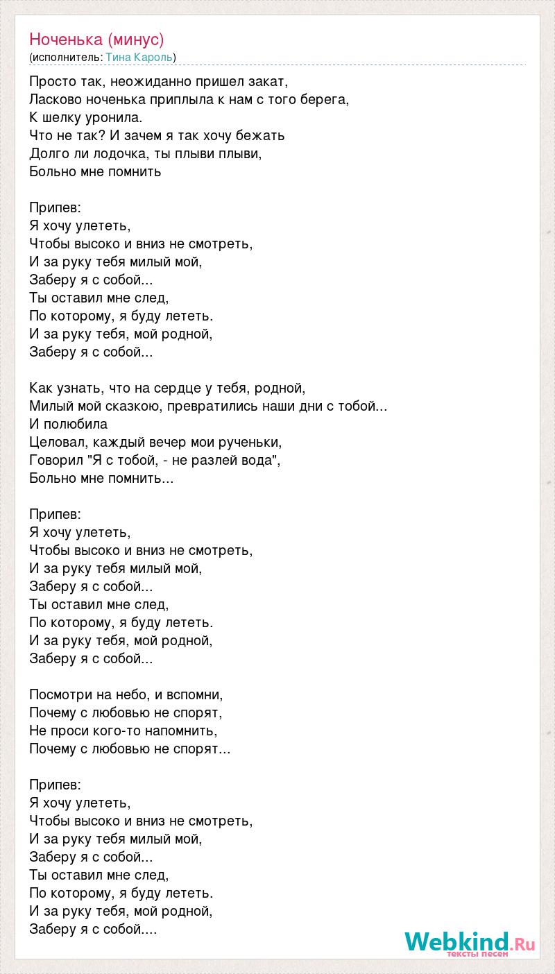 Просто так, неожиданно пришел закат, Ласково ноченька приплыла к нам с того берега, К шелку уронила. Что не так? И зачем я так хочу бежать Долго ли лодочка, ты плыви плыви, Больно мне помнить Припев: Я хочу улететь, Чтобы высоко и вниз не смотреть, И за руку тебя милый мой, Заберу я с собой... Ты оставил мне след, По которому, я буду лететь. И за руку тебя, мой родной, Заберу я с собой... Как узнать, что на сердце у тебя, родной, Милый мой сказкою, превратились наши дни с тобой... И полюбила Целовал, каждый вечер мои рученьки, Говорил "Я с тобой, - не разлей вода", Больно мне помнить... Припев: Я хочу улететь, Чтобы высоко и вниз не смотреть, И за руку тебя милый мой, Заберу я с собой... Ты оставил мне след, По которому, я буду лететь. И за руку тебя, мой родной, Заберу я с собой... Посмотри на небо, и вспомни, Почему с любовью не спорят, Не проси кого-то напомнить, Почему с любовью не спорят... Припев: Я хочу улететь, Чтобы высоко и вниз не смотреть, И за руку тебя милый мой, Заберу я с собой... Ты оставил мне след, По которому, я буду лететь. И за руку тебя, мой родной, Заберу я с собой....