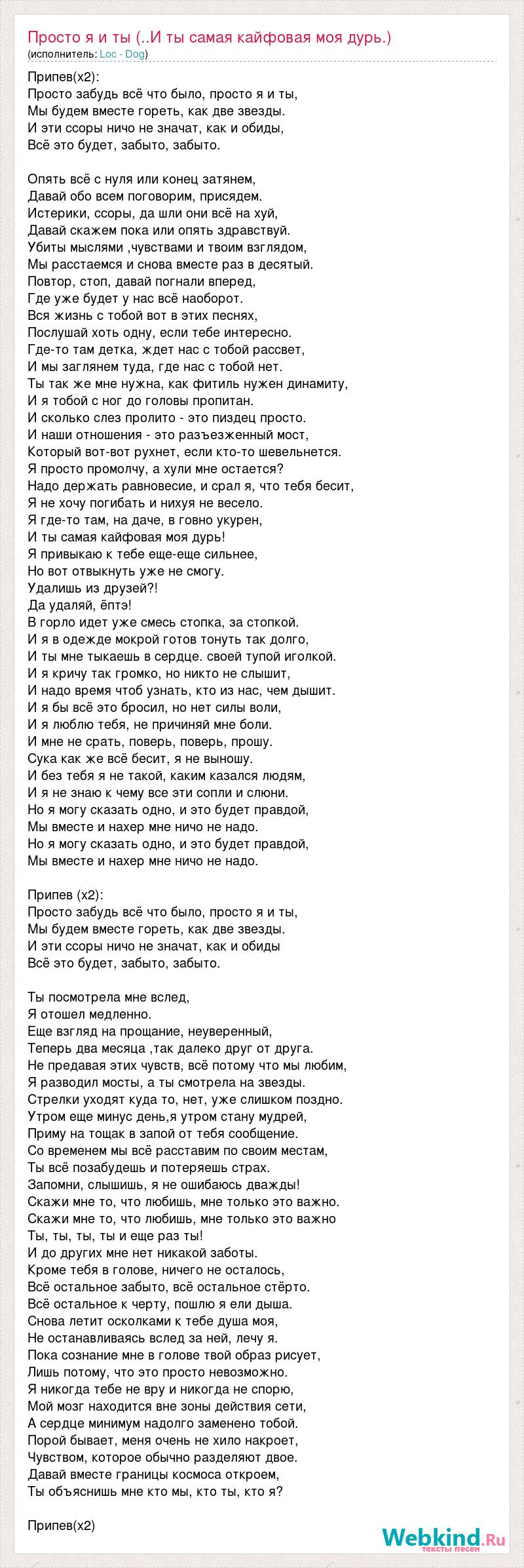 Припев(х2): Просто забудь всё что было, просто я и ты, Мы будем вместе гореть, как две звезды. И эти ссоры ничо не значат, как и обиды, Всё это будет, забыто, забыто. Опять всё с нуля или конец затянем, Давай обо всем поговорим, присядем. Истерики, ссоры, да шли они всё на хуй, Давай скажем пока или опять здравствуй. Убиты мыслями ,чувствами и твоим взглядом, Мы расстаемся и снова вместе раз в десятый. Повтор, стоп, давай погнали вперед, Где уже будет у нас всё наоборот. Вся жизнь с тобой вот в этих песнях, Послушай хоть одну, если тебе интересно. Где-то там детка, ждет нас с тобой рассвет, И мы заглянем туда, где нас с тобой нет. Ты так же мне нужна, как фитиль нужен динамиту, И я тобой с ног до головы пропитан. И сколько слез пролито - это пиздец просто. И наши отношения - это разъезженный мост, Который вот-вот рухнет, если кто-то шевельнется. Я просто промолчу, а хули мне остается? Надо держать равновесие, и срал я, что тебя бесит, Я не хочу погибать и нихуя не весело. Я где-то там, на даче, в говно укурен, И ты самая кайфовая моя дурь! Я привыкаю к тебе еще-еще сильнее, Но вот отвыкнуть уже не смогу. Удалишь из друзей?! Да удаляй, ёптэ! В горло идет уже смесь стопка, за стопкой. И я в одежде мокрой готов тонуть так долго, И ты мне тыкаешь в сердце. своей тупой иголкой. И я кричу так громко, но никто не слышит, И надо время чтоб узнать, кто из нас, чем дышит. И я бы всё это бросил, но нет силы воли, И я люблю тебя, не причиняй мне боли. И мне не срать, поверь, поверь, прошу. Сука как же всё бесит, я не выношу. И без тебя я не такой, каким казался людям, И я не знаю к чему все эти сопли и слюни. Но я могу сказать одно, и это будет правдой, Мы вместе и нахер мне ничо не надо. Но я могу сказать одно, и это будет правдой, Мы вместе и нахер мне ничо не надо. Припев (х2): Просто забудь всё что было, просто я и ты, Мы будем вместе гореть, как две звезды. И эти ссоры ничо не значат, как и обиды Всё это будет, забыто, забыто. Ты посмотрела мне вслед, Я отошел медленно. Еще взгляд на прощание, неуверенный, Теперь два месяца ,так далеко друг от друга. Не предавая этих чувств, всё потому что мы любим, Я разводил мосты, а ты смотрела на звезды. Стрелки уходят куда то, нет, уже слишком поздно. Утром еще минус день,я утром стану мудрей, Приму на тощак в запой от тебя сообщение. Со временем мы всё расставим по своим местам, Ты всё позабудешь и потеряешь страх. Запомни, слышишь, я не ошибаюсь дважды! Скажи мне то, что любишь, мне только это важно. Скажи мне то, что любишь, мне только это важно Ты, ты, ты, ты и еще раз ты! И до других мне нет никакой заботы. Кроме тебя в голове, ничего не осталось, Всё остальное забыто, всё остальное стёрто. Всё остальное к черту, пошлю я ели дыша. Снова летит осколками к тебе душа моя, Не останавливаясь вслед за ней, лечу я. Пока сознание мне в голове твой образ рисует, Лишь потому, что это просто невозможно. Я никогда тебе не вру и никогда не спорю, Мой мозг находится вне зоны действия сети, А сердце минимум надолго заменено тобой. Порой бывает, меня очень не хило накроет, Чувством, которое обычно разделяют двое. Давай вместе границы космоса откроем, Ты объяснишь мне кто мы, кто ты, кто я? Припев(х2)