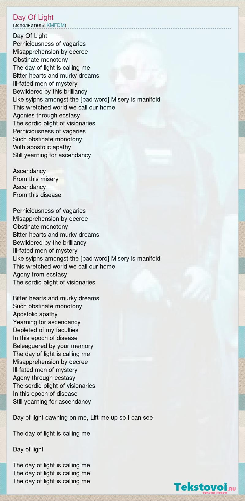 Day Of Light Perniciousness of vagaries Misapprehension by decree Obstinate monotony The day of light is calling me Bitter hearts and murky dreams Ill-fated men of mystery Bewildered by this brilliancy Like sylphs amongst the shrubberies Misery is manifold This wretched world we call our home Agonies through ecstasy The sordid plight of visionaries Perniciousness of vagaries Such obstinate monotony With apostolic apathy Still yearning for ascendancy Ascendancy From this misery Ascendancy From this disease Perniciousness of vagaries Misapprehension by decree Obstinate monotony Bitter hearts and murky dreams Bewildered by the brilliancy Ill-fated men of mystery Like sylphs amongst the shrubbery Misery is manifold This wretched world we call our home Agony from ecstasy The sordid plight of visionaries Bitter hearts and murky dreams Such obstinate monotony Apostolic apathy Yearning for ascendancy Depleted of my faculties In this epoch of disease Beleaguered by your memory The day of light is calling me Misapprehension by decree Ill-fated men of mystery Agony through ecstasy The sordid plight of visionaries In this epoch of disease Still yearning for ascendancy Day of light dawning on me, Lift me up so I can see The day of light is calling me Day of light The day of light is calling me The day of light is calling me The day of light is calling me