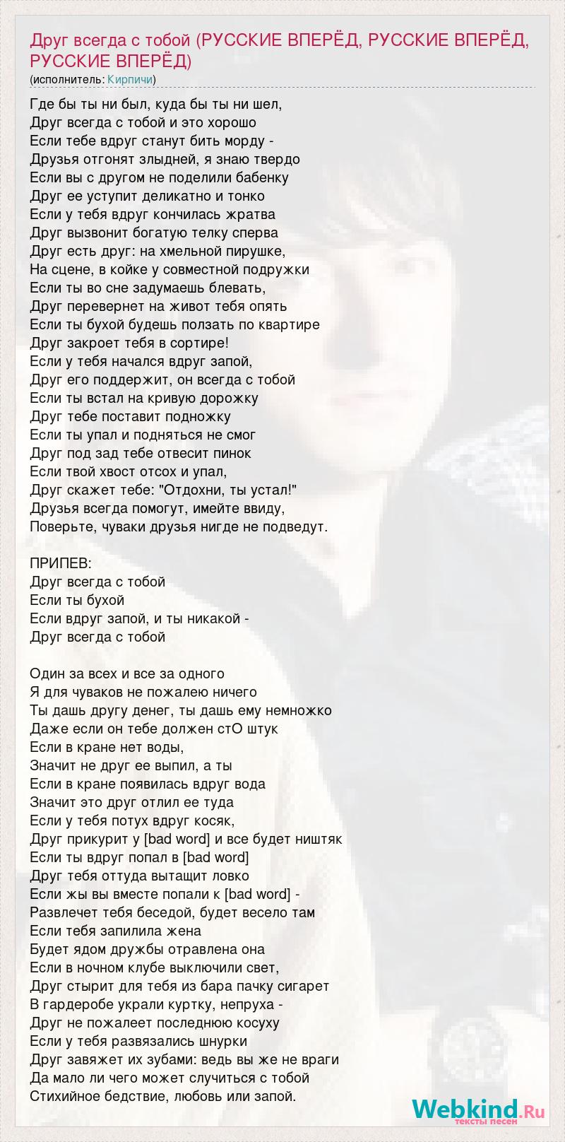 Где бы ты ни был, куда бы ты ни шел, Друг всегда с тобой и это хорошо Если тебе вдруг станут бить морду - Друзья отгонят злыдней, я знаю твердо Если вы с другом не поделили бабенку Друг ее уступит деликатно и тонко Если у тебя вдруг кончилась жратва Друг вызвонит богатую телку сперва Друг есть друг: на хмельной пирушке, На сцене, в койке у совместной подружки Если ты во сне задумаешь блевать, Друг перевернет на живот тебя опять Если ты бухой будешь ползать по квартире Друг закроет тебя в сортире! Если у тебя начался вдруг запой, Друг его поддержит, он всегда с тобой Если ты встал на кривую дорожку Друг тебе поставит подножку Если ты упал и подняться не смог Друг под зад тебе отвесит пинок Если твой хвост отсох и упал, Друг скажет тебе: "Отдохни, ты устал!" Друзья всегда помогут, имейте ввиду, Поверьте, чуваки друзья нигде не подведут. ПРИПЕВ: Друг всегда с тобой Если ты бухой Если вдруг запой, и ты никакой - Друг всегда с тобой Один за всех и все за одного Я для чуваков не пожалею ничего Ты дашь другу денег, ты дашь ему немножко Даже если он тебе должен стО штук Если в кране нет воды, Значит не друг ее выпил, а ты Если в кране появилась вдруг вода Значит это друг отлил ее туда Если у тебя потух вдруг косяк, Друг прикурит у [bad word] и все будет ништяк Если ты вдруг попал в [bad word] Друг тебя оттуда вытащит ловко Если жы вы вместе попали к [bad word] - Развлечет тебя беседой, будет весело там Если тебя запилила жена Будет ядом дружбы отравлена она Если в ночном клубе выключили свет, Друг стырит для тебя из бара пачку сигарет В гардеробе украли куртку, непруха - Друг не пожалеет последнюю косуху Если у тебя развязались шнурки Друг завяжет их зубами: ведь вы же не враги Да мало ли чего может случиться с тобой Стихийное бедствие, любовь или запой.