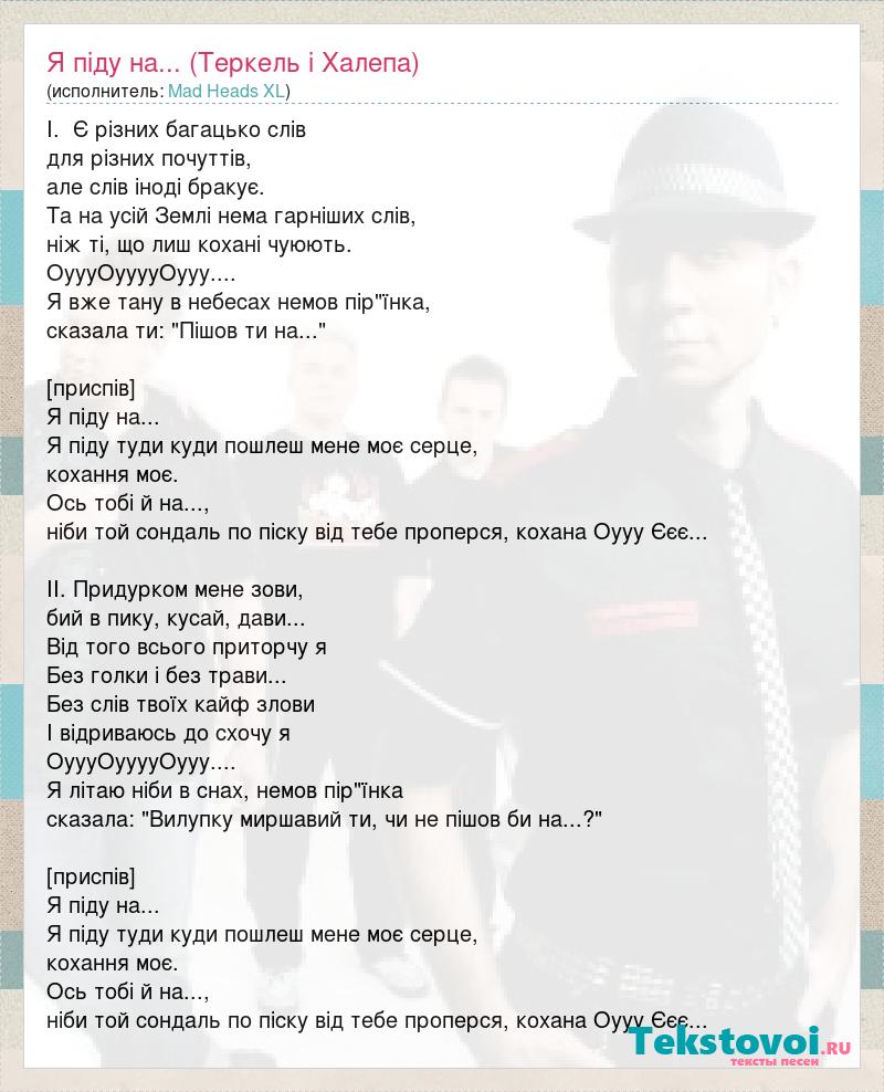 І. Є різних багацько слів для різних почуттів, але слів іноді бракує. Та на усій Землі нема гарніших слів, ніж ті, що лиш кохані чуюють. ОуууОууууОууу.... Я вже тану в небесах немов пір"їнка, сказала ти: "Пішов ти на..." [приспів] Я піду на... Я піду туди куди пошлеш мене моє серце, кохання моє. Ось тобі й на..., ніби той сондаль по піску від тебе проперся, кохана Оууу Єєє... ІІ. Придурком мене зови, бий в пику, кусай, дави... Від того всього приторчу я Без голки і без трави... Без слів твоїх кайф злови І відриваюсь до схочу я ОуууОууууОууу.... Я літаю ніби в снах, немов пір"їнка сказала: "Вилупку миршавий ти, чи не пішов би на...?" [приспів] Я піду на... Я піду туди куди пошлеш мене моє серце, кохання моє. Ось тобі й на..., ніби той сондаль по піску від тебе проперся, кохана Оууу Єєє...