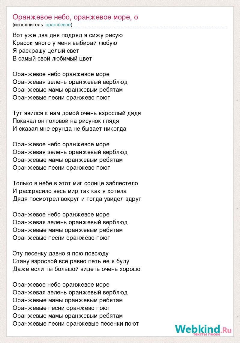 Вот уже два дня подряд я сижу рисую Красок много у меня выбирай любую Я раскрашу целый свет В самый свой любимый цвет Оранжевое небо оранжевое море Оранжевая зелень оранжевый верблюд Оранжевые мамы оранжевым ребятам Оранжевые песни оранжево поют Тут явился к нам домой очень взрослый дядя Покачал он головой на рисунок глядя И сказал мне ерунда не бывает никогда Оранжевое небо оранжевое море Оранжевая зелень оранжевый верблюд Оранжевые мамы оранжевым ребятам Оранжевые песни оранжево поют Только в небе в этот миг солнце заблестело И раскрасило весь мир так как я хотела Дядя посмотрел вокруг и тогда увидел вдруг Оранжевое небо оранжевое море Оранжевая зелень оранжевый верблюд Оранжевые мамы оранжевым ребятам Оранжевые песни оранжево поют Эту песенку давно я пою повсюду Стану взрослой все равно петь ее я буду Даже если ты большой видеть очень хорошо Оранжевое небо оранжевое море Оранжевая зелень оранжевый верблюд Оранжевые мамы оранжевым ребятам Оранжевые песни оранжево поют Оранжевые мамы оранжевым ребятам Оранжевые песни оранжевые песенки поют