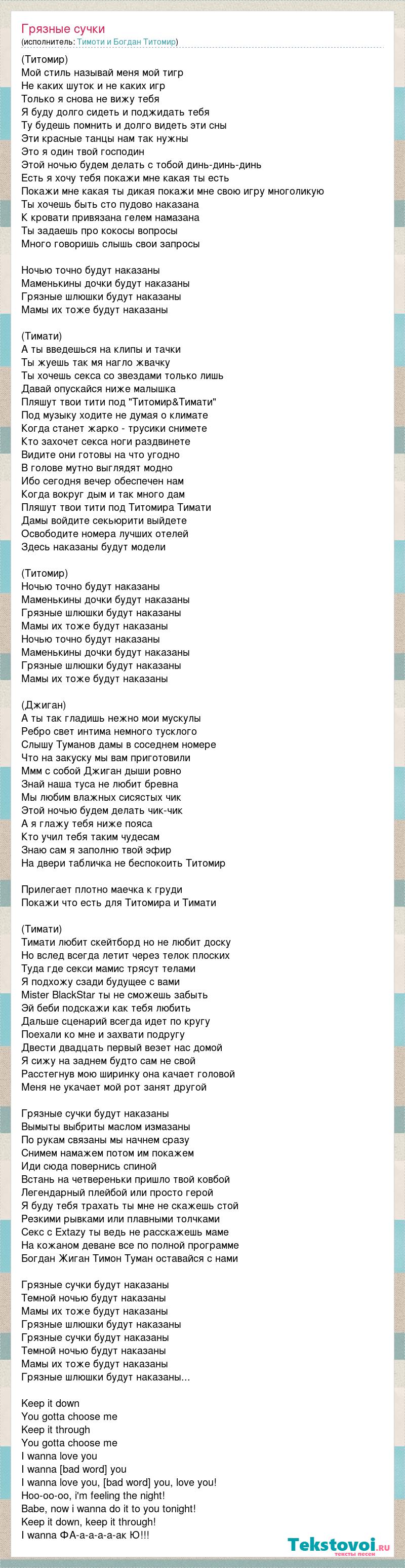 (Титомир) Мой стиль называй меня мой тигр Не каких шуток и не каких игр Только я снова не вижу тебя Я буду долго сидеть и поджидать тебя Ту будешь помнить и долго видеть эти сны Эти красные танцы нам так нужны Это я один твой господин Этой ночью будем делать с тобой динь-динь-динь Есть я хочу тебя покажи мне какая ты есть Покажи мне какая ты дикая покажи мне свою игру многоликую Ты хочешь быть сто пудово наказана К кровати привязана гелем намазана Ты задаешь про кокосы вопросы Много говоришь слышь свои запросы Ночью точно будут наказаны Маменькины дочки будут наказаны Грязные шлюшки будут наказаны Мамы их тоже будут наказаны (Тимати) А ты введешься на клипы и тачки Ты жуешь так мя нагло жвачку Ты хочешь секса со звездами только лишь Давай опускайся ниже малышка Пляшут твои тити под "Титомир&Тимати" Под музыку ходите не думая о климате Когда станет жарко - трусики снимете Кто захочет секса ноги раздвинете Видите они готовы на что угодно В голове мутно выглядят модно Ибо сегодня вечер обеспечен нам Когда вокруг дым и так много дам Пляшут твои тити под Титомира Тимати Дамы войдите секьюрити выйдете Освободите номера лучших отелей Здесь наказаны будут модели (Титомир) Ночью точно будут наказаны Маменькины дочки будут наказаны Грязные шлюшки будут наказаны Мамы их тоже будут наказаны Ночью точно будут наказаны Маменькины дочки будут наказаны Грязные шлюшки будут наказаны Мамы их тоже будут наказаны (Джиган) А ты так гладишь нежно мои мускулы Ребро свет интима немного тусклого Слышу Туманов дамы в соседнем номере Что на закуску мы вам приготовили Ммм с собой Джиган дыши ровно Знай наша туса не любит бревна Мы любим влажных сисястых чик Этой ночью будем делать чик-чик А я глажу тебя ниже пояса Кто учил тебя таким чудесам Знаю сам я заполню твой эфир На двери табличка не беспокоить Титомир Прилегает плотно маечка к груди Покажи что есть для Титомира и Тимати (Тимати) Тимати любит скейтборд но не любит доску Но вслед всегда летит через телок плоских Туда где секси мамис трясут телами Я подхожу сзади будущее с вами Mister BlackStar ты не сможешь забыть Эй беби подскажи как тебя любить Дальше сценарий всегда идет по кругу Поехали ко мне и захвати подругу Двести двадцать первый везет нас домой Я сижу на заднем будто сам не свой Расстегнув мою ширинку она качает головой Меня не укачает мой рот занят другой Грязные сучки будут наказаны Вымыты выбриты маслом измазаны По рукам связаны мы начнем сразу Снимем намажем потом им покажем Иди сюда повернись спиной Встань на четвереньки пришло твой ковбой Легендарный плейбой или просто герой Я буду тебя трахать ты мне не скажешь стой Резкими рывками или плавными толчками Секс с Extazy ты ведь не расскажешь маме На кожаном деване все по полной программе Богдан Жиган Тимон Туман оставайся с нами Грязные сучки будут наказаны Темной ночью будут наказаны Мамы их тоже будут наказаны Грязные шлюшки будут наказаны Грязные сучки будут наказаны Темной ночью будут наказаны Мамы их тоже будут наказаны Грязные шлюшки будут наказаны... Keep it down You gotta choose me Keep it through You gotta choose me I wanna love you I wanna [bad word] you I wanna love you, [bad word] you, love you! Hoo-oo-oo, i'm feeling the night! Babe, now i wanna do it to you tonight! Keep it down, keep it through! I wanna ФА-а-а-а-а-ак Ю!!!