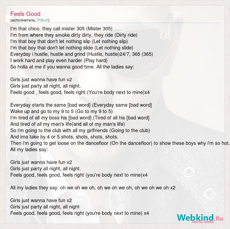 I'm that chico, they call mister 305 (Mister 305) I'm from where they smoke dirty dirty, they ride (Dirty ride) I'm that boy that don't let nothing slip (Let nothing slip) I'm that boy that don't let nothing slide (Let nothing slide) Everyday i hustle, hustle and grind (Hustle, hustle)24/7, 365 (365) I work hard and play even harder (Play hard) So holla at me if you wanna good time. All the ladies say: Girls just wanna have fun x2 Girls just party all night, all night. Feels good , feels good, feels right.(You're body next to mine)x4 Everyday starts the same [bad word] (Everyday same [bad word] Wake up and go to my 9 to 5 (Go to my 9 to 5) I'm tired of all my boss his [bad word] (Tired of all his [bad word] And tired of all my man's life(and all of my man's life) So i'm going to the club with all my girlfriends (Going to the club) And ima take by 4 or 5 shots, shots, shots, shots. Then i'm going to get loose on the dancefloor (On the dancefloor) to show these boys why i'm so hot. All my ladies say: Girls just wanna have fun x2 Girls just party all night, all night. Feels good, feels good, feels right (you're body next to mine)x4 All my ladies they say: oh we oh we oh, oh we oh we oh, oh we oh we oh x2 Girls just wanna have fun x2 Girls just party all night, all night Feels good, feels good, feels right (you're body next to mine) x4