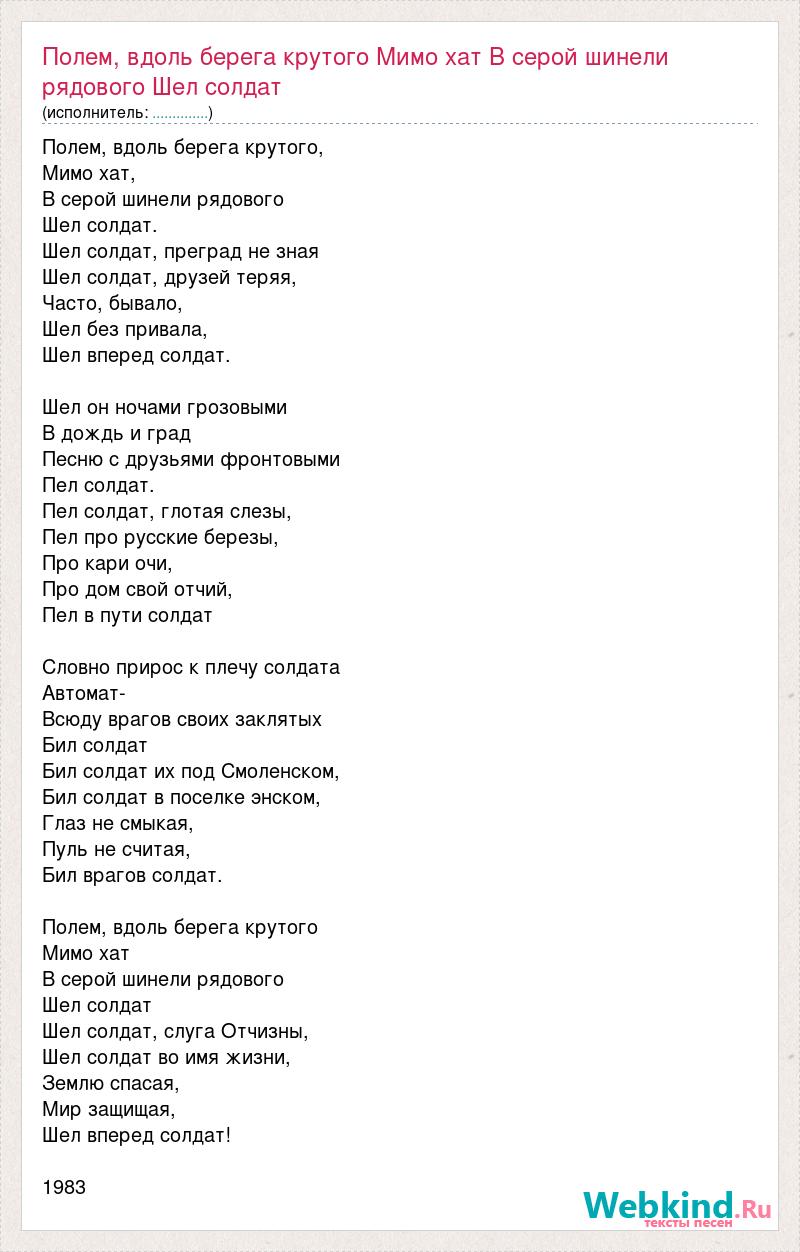 Полем, вдоль берега крутого, Мимо хат, В серой шинели рядового Шел солдат. Шел солдат, преград не зная Шел солдат, друзей теряя, Часто, бывало, Шел без привала, Шел вперед солдат. Шел он ночами грозовыми В дождь и град Песню с друзьями фронтовыми Пел солдат. Пел солдат, глотая слезы, Пел про русские березы, Про кари очи, Про дом свой отчий, Пел в пути солдат Словно прирос к плечу солдата Автомат- Всюду врагов своих заклятых Бил солдат Бил солдат их под Смоленском, Бил солдат в поселке энском, Глаз не смыкая, Пуль не считая, Бил врагов солдат. Полем, вдоль берега крутого Мимо хат В серой шинели рядового Шел солдат Шел солдат, слуга Отчизны, Шел солдат во имя жизни, Землю спасая, Мир защищая, Шел вперед солдат! 1983