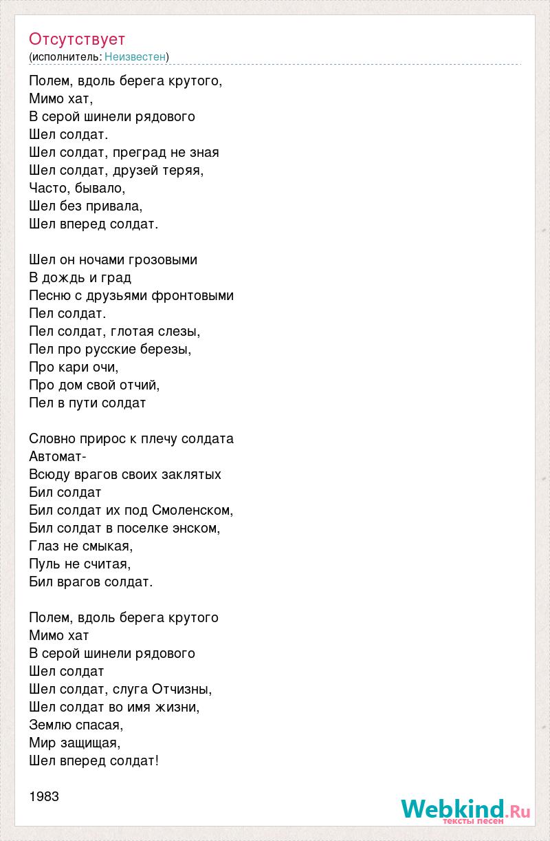 Полем, вдоль берега крутого, Мимо хат, В серой шинели рядового Шел солдат. Шел солдат, преград не зная Шел солдат, друзей теряя, Часто, бывало, Шел без привала, Шел вперед солдат. Шел он ночами грозовыми В дождь и град Песню с друзьями фронтовыми Пел солдат. Пел солдат, глотая слезы, Пел про русские березы, Про кари очи, Про дом свой отчий, Пел в пути солдат Словно прирос к плечу солдата Автомат- Всюду врагов своих заклятых Бил солдат Бил солдат их под Смоленском, Бил солдат в поселке энском, Глаз не смыкая, Пуль не считая, Бил врагов солдат. Полем, вдоль берега крутого Мимо хат В серой шинели рядового Шел солдат Шел солдат, слуга Отчизны, Шел солдат во имя жизни, Землю спасая, Мир защищая, Шел вперед солдат! 1983