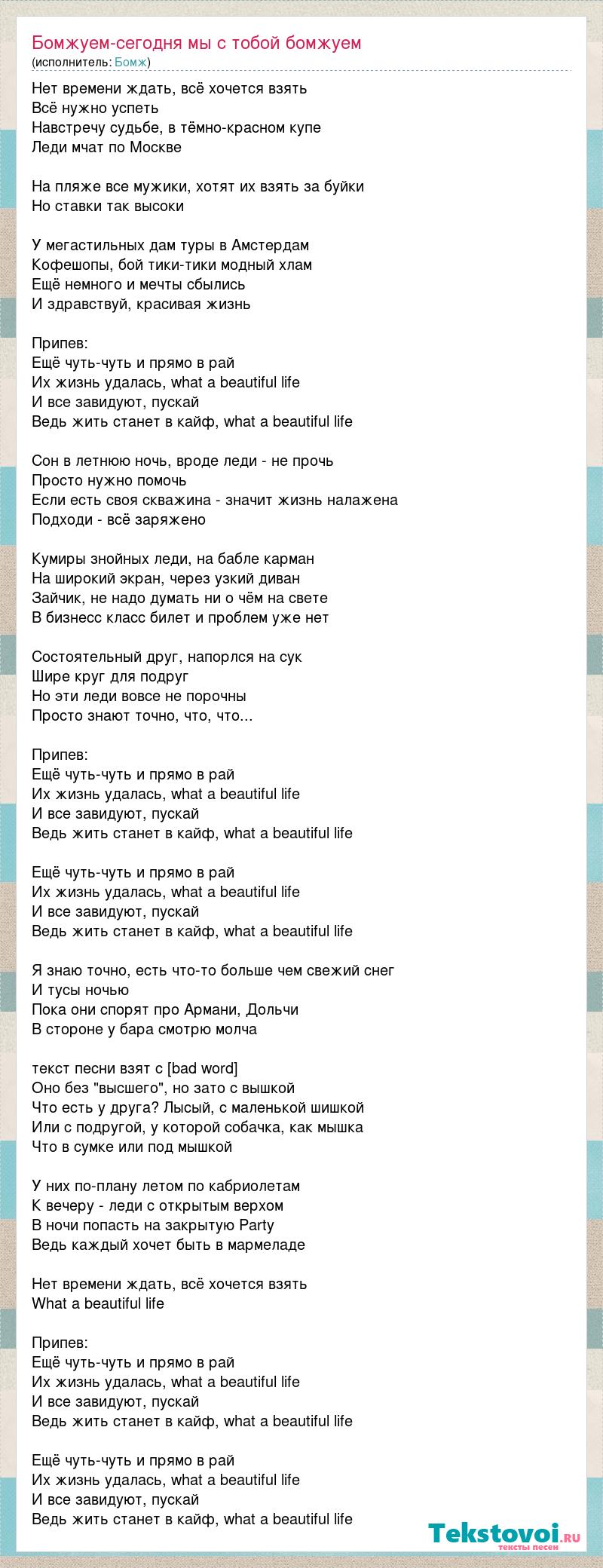 Нет времени ждать, всё хочется взять Всё нужно успеть Навстречу судьбе, в тёмно-красном купе Леди мчат по Москве На пляже все мужики, хотят их взять за буйки Но ставки так высоки У мегастильных дам туры в Амстердам Кофешопы, бой тики-тики модный хлам Ещё немного и мечты сбылись И здравствуй, красивая жизнь Припев: Ещё чуть-чуть и прямо в рай Их жизнь удалась, what a beautiful life И все завидуют, пускай Ведь жить станет в кайф, what a beautiful life Сон в летнюю ночь, вроде леди - не прочь Просто нужно помочь Если есть своя скважина - значит жизнь налажена Подходи - всё заряжено Кумиры знойных леди, на бабле карман На широкий экран, через узкий диван Зайчик, не надо думать ни о чём на свете В бизнесс класс билет и проблем уже нет Состоятельный друг, напорлся на сук Шире круг для подруг Но эти леди вовсе не порочны Просто знают точно, что, что... Припев: Ещё чуть-чуть и прямо в рай Их жизнь удалась, what a beautiful life И все завидуют, пускай Ведь жить станет в кайф, what a beautiful life Ещё чуть-чуть и прямо в рай Их жизнь удалась, what a beautiful life И все завидуют, пускай Ведь жить станет в кайф, what a beautiful life Я знаю точно, есть что-то больше чем свежий снег И тусы ночью Пока они спорят про Армани, Дольчи В стороне у бара смотрю молча текст песни взят с [bad word] Оно без "высшего", но зато с вышкой Что есть у друга? Лысый, с маленькой шишкой Или с подругой, у которой собачка, как мышка Что в сумке или под мышкой У них по-плану летом по кабриолетам К вечеру - леди с открытым верхом В ночи попасть на закрытую Party Ведь каждый хочет быть в мармеладе Нет времени ждать, всё хочется взять What a beautiful life Припев: Ещё чуть-чуть и прямо в рай Их жизнь удалась, what a beautiful life И все завидуют, пускай Ведь жить станет в кайф, what a beautiful life Ещё чуть-чуть и прямо в рай Их жизнь удалась, what a beautiful life И все завидуют, пускай Ведь жить станет в кайф, what a beautiful life