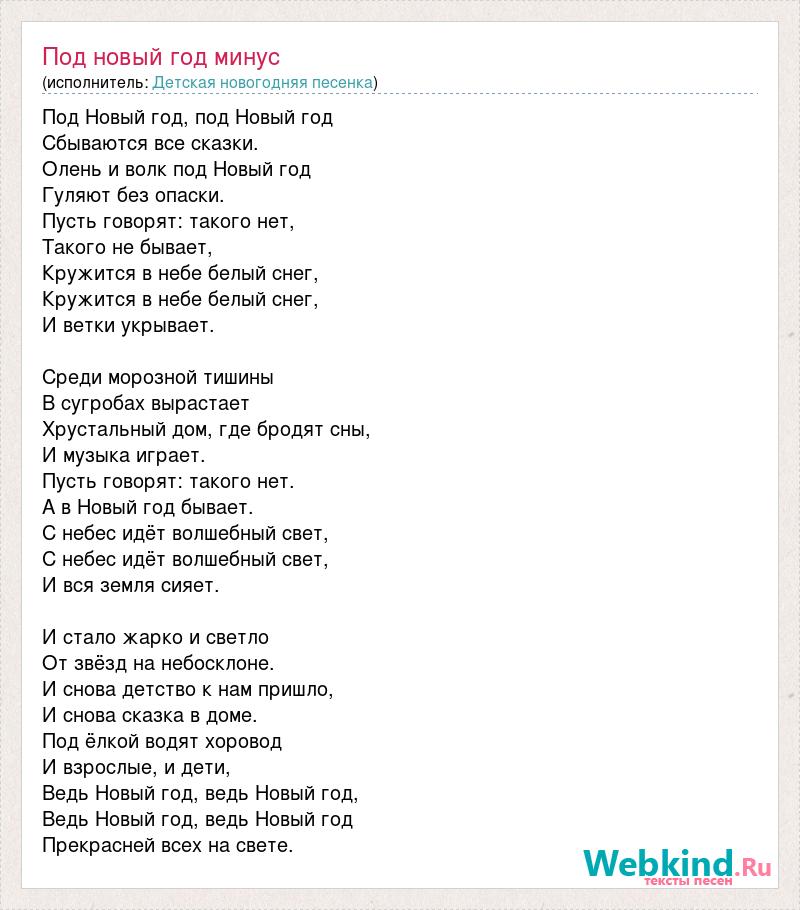 Под Новый год, под Новый год Сбываются все сказки. Олень и волк под Новый год Гуляют без опаски. Пусть говорят: такого нет, Такого не бывает, Кружится в небе белый снег, Кружится в небе белый снег, И ветки укрывает. Среди морозной тишины В сугробах вырастает Хрустальный дом, где бродят сны, И музыка играет. Пусть говорят: такого нет. А в Новый год бывает. С небес идёт волшебный свет, С небес идёт волшебный свет, И вся земля сияет. И стало жарко и светло От звёзд на небосклоне. И снова детство к нам пришло, И снова сказка в доме. Под ёлкой водят хоровод И взрослые, и дети, Ведь Новый год, ведь Новый год, Ведь Новый год, ведь Новый год Прекрасней всех на свете.