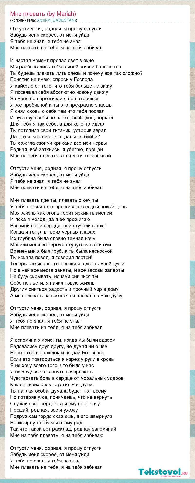 Отпусти меня, родная, я прошу отпусти Забудь меня скорее, от меня уйди Я тебя не знал, я тебя не знал Мне плевать на тебя, я на тебя забивал И настал момент пропал свет в окне Мы разбежались тебя в моей жизни больше нет Ты будешь плакать лить слезы и почему все так сложно? Понятия не имею..спроси у Господа Я кайфую от того, что тебя больше не вижу Я посвящал себя абсолютно новому движу За меня не переживай я не потеряюсь Я же пробивной и ты это прекрасно знаешь Я снял оковы с себя тем что тебя послал И чувствую себя не плохо, свободно, нормал Для тебя я так себе, а для кого-то идеал Ты потопила свой титаник, устроив аврал Да, окей, я эгоист, что дальше, бэйби? Ты сожгла своими криками все мои нервы Родная, всё заткнись, я убегаю, прощай Мне на тебя плевать, а ты меня не забывай Отпусти меня, родная, я прошу отпусти Забудь меня скорее, от меня уйди Я тебя не знал, я тебя не знал Мне плевать на тебя, я на тебя забивал Мне плевать где ты, плевать с кем ты Я тебя прожил как проживаю каждый новый день Моя жизнь как огонь горит ярким пламенем И пока я молод, да я ее прожигаю Вспомни наши сердца, они стучали в такт Когда я тонул в твоих черных глазах Их глубина была словно темная ночь Манили меня все время окунуться в эти очи Временами я был груб, а ты была несносной Ты искала повод, я говорил постой! Теперь все иначе, ты рвешься в дверь моей души Но в ней все места заняты, и все засовы заперты Не буду скрывать, ночами снишься ты Себе не льсти, я начал новую жизнь Другим сниться радость и прочный мир в дому А мне плевать на всё как ты плевала в мою душу Отпусти меня, родная, я прошу отпусти Забудь меня скорее, от меня уйди Я тебя не знал, я тебя не знал Мне плевать на тебя, я на тебя забивал Я вспоминаю моменты, когда мы были вдвоем Радовались друг другу, не думая ни о чем Но это всё в прошлом и не дай Бог вновь Если это повториться я изрежу руки в кровь Я не хочу всего того, что было у нас Я не хочу все это опять возвращать Чувствовать боль в сердце от моральных ударов Как от твоих слов грустит моя душа Ты наглая особа, думала будет по-твоему Но потеряв уже, понимаешь, что не вернуть Слушай свое сердце, а я ему прошепчу Прощай, родная, все я ухожу Подружкам гордо скажешь, я его швырнула Но швырнул тебя я и этому рад Так что такой вот расклад, родная запоминай Мне на тебя плевать, я на тебя забиваю Отпусти меня, родная, я прошу отпусти Забудь меня скорее, от меня уйди Я тебя не знал, я тебя не знал Мне плевать на тебя, я на тебя забивал
