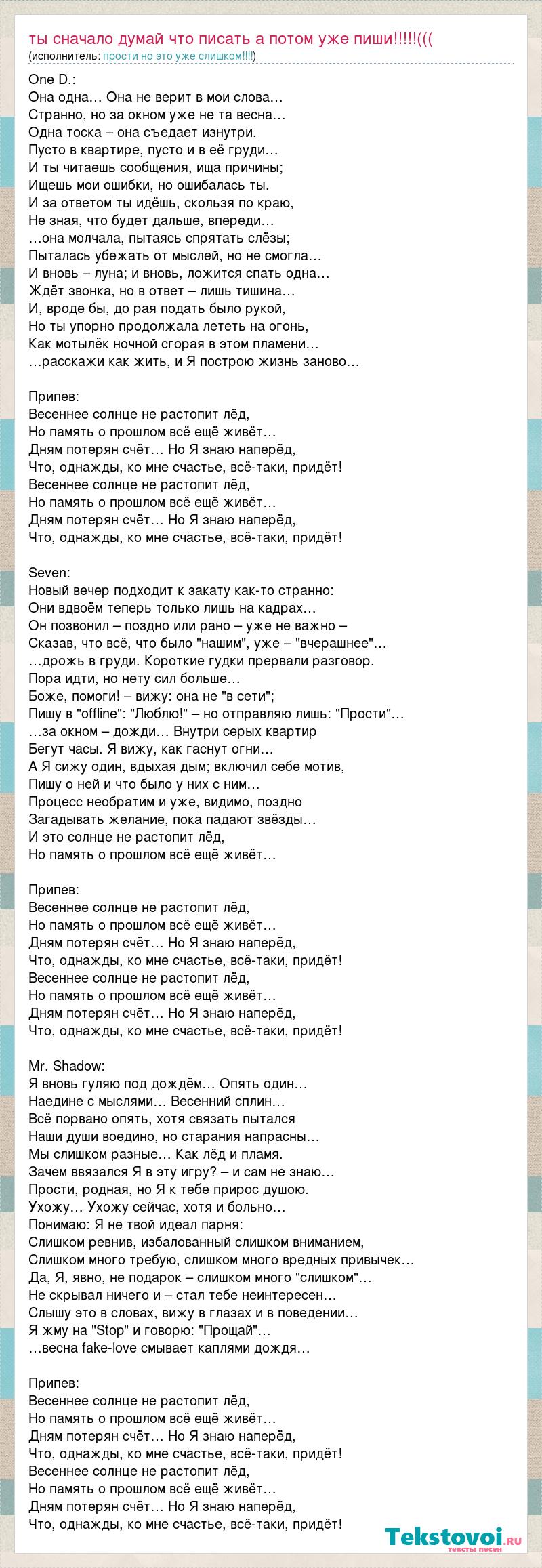 One D.: Она одна… Она не верит в мои слова… Странно, но за окном уже не та весна… Одна тоска – она съедает изнутри. Пусто в квартире, пусто и в её груди… И ты читаешь сообщения, ища причины; Ищешь мои ошибки, но ошибалась ты. И за ответом ты идёшь, скользя по краю, Не зная, что будет дальше, впереди… …она молчала, пытаясь спрятать слёзы; Пыталась убежать от мыслей, но не смогла… И вновь – луна; и вновь, ложится спать одна… Ждёт звонка, но в ответ – лишь тишина… И, вроде бы, до рая подать было рукой, Но ты упорно продолжала лететь на огонь, Как мотылёк ночной сгорая в этом пламени… …расскажи как жить, и Я построю жизнь заново… Припев: Весеннее солнце не растопит лёд, Но память о прошлом всё ещё живёт… Дням потерян счёт… Но Я знаю наперёд, Что, однажды, ко мне счастье, всё-таки, придёт! Весеннее солнце не растопит лёд, Но память о прошлом всё ещё живёт… Дням потерян счёт… Но Я знаю наперёд, Что, однажды, ко мне счастье, всё-таки, придёт! Seven: Новый вечер подходит к закату как-то странно: Они вдвоём теперь только лишь на кадрах… Он позвонил – поздно или рано – уже не важно – Сказав, что всё, что было "нашим", уже – "вчерашнее"… …дрожь в груди. Короткие гудки прервали разговор. Пора идти, но нету сил больше… Боже, помоги! – вижу: она не "в сети"; Пишу в "offline": "Люблю!" – но отправляю лишь: "Прости"… …за окном – дожди… Внутри серых квартир Бегут часы. Я вижу, как гаснут огни… А Я сижу один, вдыхая дым; включил себе мотив, Пишу о ней и что было у них с ним… Процесс необратим и уже, видимо, поздно Загадывать желание, пока падают звёзды… И это солнце не растопит лёд, Но память о прошлом всё ещё живёт… Припев: Весеннее солнце не растопит лёд, Но память о прошлом всё ещё живёт… Дням потерян счёт… Но Я знаю наперёд, Что, однажды, ко мне счастье, всё-таки, придёт! Весеннее солнце не растопит лёд, Но память о прошлом всё ещё живёт… Дням потерян счёт… Но Я знаю наперёд, Что, однажды, ко мне счастье, всё-таки, придёт! Mr. Shadow: Я вновь гуляю под дождём… Опять один… Наедине с мыслями… Весенний сплин… Всё порвано опять, хотя связать пытался Наши души воедино, но старания напрасны… Мы слишком разные… Как лёд и пламя. Зачем ввязался Я в эту игру? – и сам не знаю… Прости, родная, но Я к тебе прирос душою. Ухожу… Ухожу сейчас, хотя и больно… Понимаю: Я не твой идеал парня: Слишком ревнив, избалованный слишком вниманием, Слишком много требую, слишком много вредных привычек… Да, Я, явно, не подарок – слишком много "слишком"… Не скрывал ничего и – стал тебе неинтересен… Слышу это в словах, вижу в глазах и в поведении… Я жму на "Stop" и говорю: "Прощай"… …весна fake-love смывает каплями дождя… Припев: Весеннее солнце не растопит лёд, Но память о прошлом всё ещё живёт… Дням потерян счёт… Но Я знаю наперёд, Что, однажды, ко мне счастье, всё-таки, придёт! Весеннее солнце не растопит лёд, Но память о прошлом всё ещё живёт… Дням потерян счёт… Но Я знаю наперёд, Что, однажды, ко мне счастье, всё-таки, придёт!