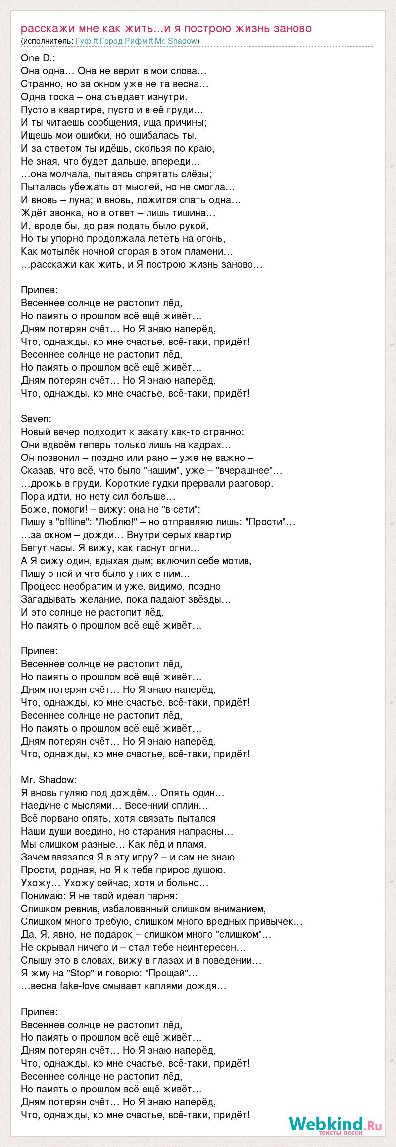 One D.: Она одна… Она не верит в мои слова… Странно, но за окном уже не та весна… Одна тоска – она съедает изнутри. Пусто в квартире, пусто и в её груди… И ты читаешь сообщения, ища причины; Ищешь мои ошибки, но ошибалась ты. И за ответом ты идёшь, скользя по краю, Не зная, что будет дальше, впереди… …она молчала, пытаясь спрятать слёзы; Пыталась убежать от мыслей, но не смогла… И вновь – луна; и вновь, ложится спать одна… Ждёт звонка, но в ответ – лишь тишина… И, вроде бы, до рая подать было рукой, Но ты упорно продолжала лететь на огонь, Как мотылёк ночной сгорая в этом пламени… …расскажи как жить, и Я построю жизнь заново… Припев: Весеннее солнце не растопит лёд, Но память о прошлом всё ещё живёт… Дням потерян счёт… Но Я знаю наперёд, Что, однажды, ко мне счастье, всё-таки, придёт! Весеннее солнце не растопит лёд, Но память о прошлом всё ещё живёт… Дням потерян счёт… Но Я знаю наперёд, Что, однажды, ко мне счастье, всё-таки, придёт! Seven: Новый вечер подходит к закату как-то странно: Они вдвоём теперь только лишь на кадрах… Он позвонил – поздно или рано – уже не важно – Сказав, что всё, что было "нашим", уже – "вчерашнее"… …дрожь в груди. Короткие гудки прервали разговор. Пора идти, но нету сил больше… Боже, помоги! – вижу: она не "в сети"; Пишу в "offline": "Люблю!" – но отправляю лишь: "Прости"… …за окном – дожди… Внутри серых квартир Бегут часы. Я вижу, как гаснут огни… А Я сижу один, вдыхая дым; включил себе мотив, Пишу о ней и что было у них с ним… Процесс необратим и уже, видимо, поздно Загадывать желание, пока падают звёзды… И это солнце не растопит лёд, Но память о прошлом всё ещё живёт… Припев: Весеннее солнце не растопит лёд, Но память о прошлом всё ещё живёт… Дням потерян счёт… Но Я знаю наперёд, Что, однажды, ко мне счастье, всё-таки, придёт! Весеннее солнце не растопит лёд, Но память о прошлом всё ещё живёт… Дням потерян счёт… Но Я знаю наперёд, Что, однажды, ко мне счастье, всё-таки, придёт! Mr. Shadow: Я вновь гуляю под дождём… Опять один… Наедине с мыслями… Весенний сплин… Всё порвано опять, хотя связать пытался Наши души воедино, но старания напрасны… Мы слишком разные… Как лёд и пламя. Зачем ввязался Я в эту игру? – и сам не знаю… Прости, родная, но Я к тебе прирос душою. Ухожу… Ухожу сейчас, хотя и больно… Понимаю: Я не твой идеал парня: Слишком ревнив, избалованный слишком вниманием, Слишком много требую, слишком много вредных привычек… Да, Я, явно, не подарок – слишком много "слишком"… Не скрывал ничего и – стал тебе неинтересен… Слышу это в словах, вижу в глазах и в поведении… Я жму на "Stop" и говорю: "Прощай"… …весна fake-love смывает каплями дождя… Припев: Весеннее солнце не растопит лёд, Но память о прошлом всё ещё живёт… Дням потерян счёт… Но Я знаю наперёд, Что, однажды, ко мне счастье, всё-таки, придёт! Весеннее солнце не растопит лёд, Но память о прошлом всё ещё живёт… Дням потерян счёт… Но Я знаю наперёд, Что, однажды, ко мне счастье, всё-таки, придёт!