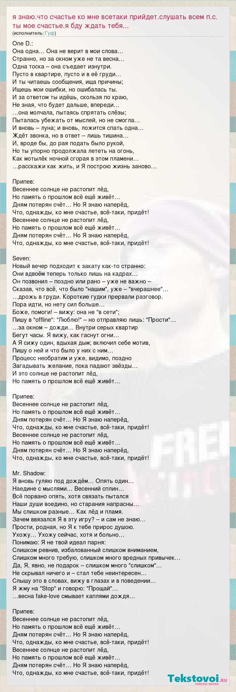 Главная→Исполнители→Гуф→Я знаю.что счастье ко мне всетаки прийдет.слушать всем п.с. ты мое счастье.я бду