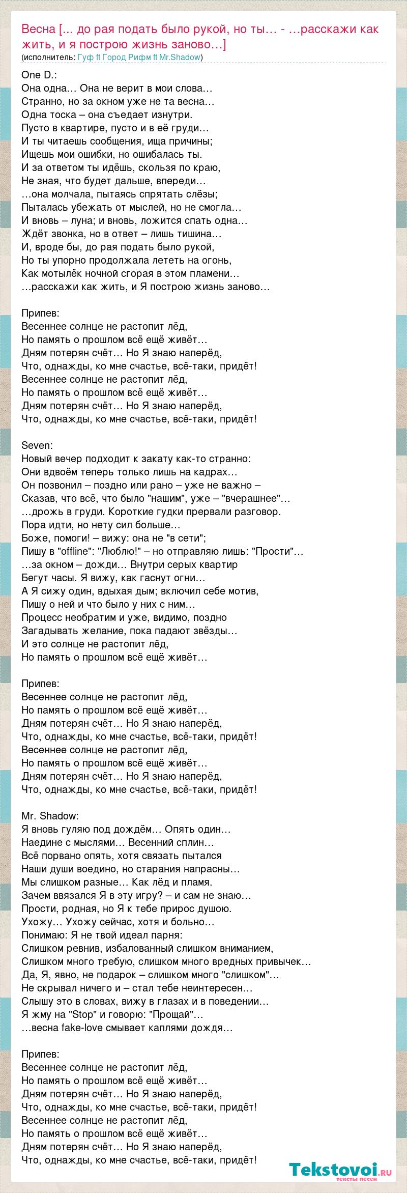 Главная→Исполнители→Гуф ft Город Рифм ft Mr.Shadow→Весна [... до рая подать было рукой, но ты… - …расскажи как жить, и я