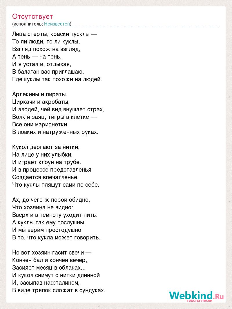 Лица стерты, краски тусклы — То ли люди, то ли куклы, Взгляд похож на взгляд, А тень — на тень. И я устал и, отдыхая, В балаган вас приглашаю, Где куклы так похожи на людей. Арлекины и пираты, Циркачи и акробаты, И злодей, чей вид внушает страх, Волк и заяц, тигры в клетке — Все они марионетки В ловких и натруженных руках. Кукол дергают за нитки, На лице у них улыбки, И играет клоун на трубе. И в процессе представленья Создается впечатленье, Что куклы пляшут сами по себе. Ах, до чего ж порой обидно, Что хозяина не видно: Вверх и в темноту уходит нить. А куклы так ему послушны, И мы верим простодушно В то, что кукла может говорить. Но вот хозяин гасит свечи — Кончен бал и кончен вечер, Засияет месяц в облаках... И кукол снимут с нитки длинной И, засыпав нафталином, В виде тряпок сложат в сундуках.