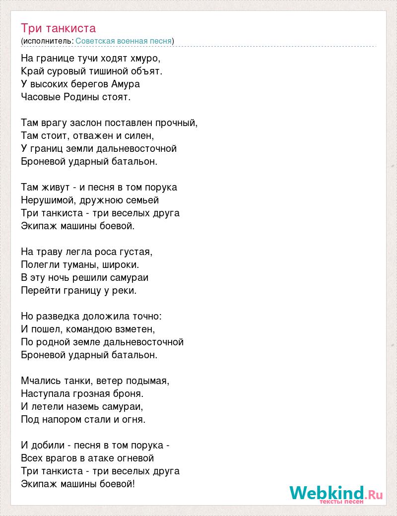 На границе тучи ходят хмуро, Край суровый тишиной объят. У высоких берегов Амура Часовые Родины стоят. Там врагу заслон поставлен прочный, Там стоит, отважен и силен, У границ земли дальневосточной Броневой ударный батальон. Там живут - и песня в том порука Нерушимой, дружною семьей Три танкиста - три веселых друга Экипаж машины боевой. На траву легла роса густая, Полегли туманы, широки. В эту ночь решили самураи Перейти границу у реки. Но разведка доложила точно: И пошел, командою взметен, По родной земле дальневосточной Броневой ударный батальон. Мчались танки, ветер подымая, Наступала грозная броня. И летели наземь самураи, Под напором стали и огня. И добили - песня в том порука - Всех врагов в атаке огневой Три танкиста - три веселых друга Экипаж машины боевой!