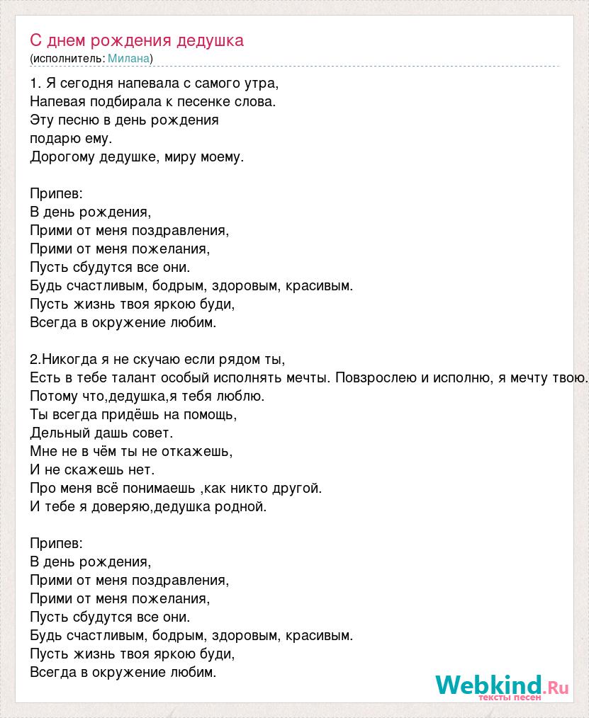 1. Я сегодня напевала с самого утра, Напевая подбирала к песенке слова. Эту песню в день рождения подарю ему. Дорогому дедушке, миру моему. Припев: В день рождения, Прими от меня поздравления, Прими от меня пожелания, Пусть сбудутся все они. Будь счастливым, бодрым, здоровым, красивым. Пусть жизнь твоя яркою буди, Всегда в окружение любим. 2.Никогда я не скучаю если рядом ты, Есть в тебе талант особый исполнять мечты. Повзрослею и исполню, я мечту твою. Потому что,дедушка,я тебя люблю. Ты всегда придёшь на помощь, Дельный дашь совет. Мне не в чём ты не откажешь, И не скажешь нет. Про меня всё понимаешь ,как никто другой. И тебе я доверяю,дедушка родной. Припев: В день рождения, Прими от меня поздравления, Прими от меня пожелания, Пусть сбудутся все они. Будь счастливым, бодрым, здоровым, красивым. Пусть жизнь твоя яркою буди, Всегда в окружение любим.