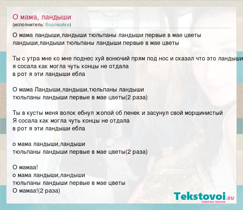 О мама ландыши,ландыши тюльпаны ландыши первые в мае цветы ландыши,ландыши тюльпаны ландыши первые в мае цветы Ты с утра мне ко мне поднес хуй вонючий прям под нос и сказал что это ландыши я сосала как могла чуть концы не отдала в рот я эти ландыши ебла О мама Ландыши,ландыши,тюльпаны ландыши тюльпаны ландыши первые в мае цветы(2 раза) Ты в кусты меня волок ебнул жопой об пенек и засунул свой морщинистый Я сосала как могла чуть концы не отдала в рот я эти ландыши ебла о мама ландыши,ландыши тюльпаны ландыши первые в мае цветы(2 раза) О мамаа! о мама ландыши,ландыши тюльпаны ландыши первые в мае цветы О мамаа!(2 раза)