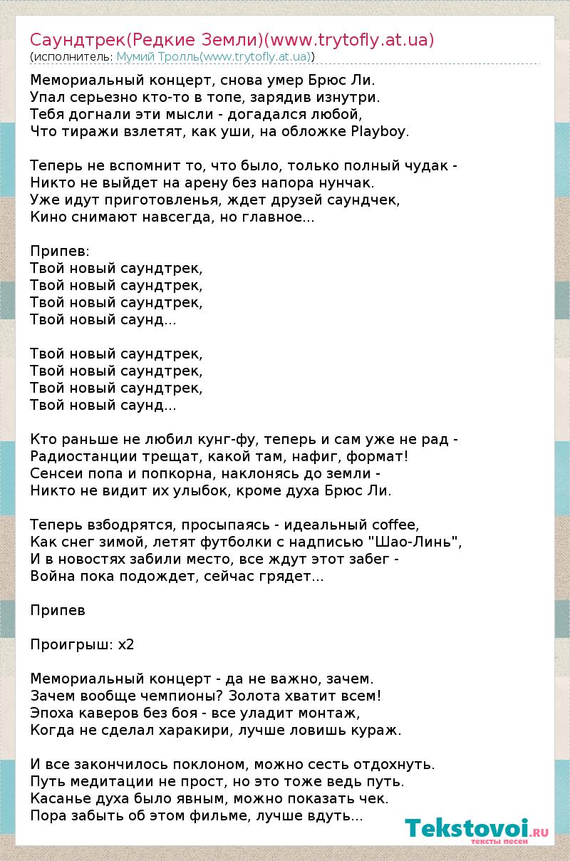 Мемориальный концерт, снова умер Брюс Ли. Упал серьезно кто-то в топе, зарядив изнутри. Тебя догнали эти мысли - догадался любой, Что тиражи взлетят, как уши, на обложке Playboy. Теперь не вспомнит то, что было, только полный чудак - Никто не выйдет на арену без напора нунчак. Уже идут приготовленья, ждет друзей саундчек, Кино снимают навсегда, но главное... Припев: Твой новый саундтрек, Твой новый саундтрек, Твой новый саундтрек, Твой новый саунд... Твой новый саундтрек, Твой новый саундтрек, Твой новый саундтрек, Твой новый саунд... Кто раньше не любил кунг-фу, теперь и сам уже не рад - Радиостанции трещат, какой там, нафиг, формат! Сенсеи попа и попкорна, наклонясь до земли - Никто не видит их улыбок, кроме духа Брюс Ли. Теперь взбодрятся, просыпаясь - идеальный coffee, Как снег зимой, летят футболки с надписью "Шао-Линь", И в новостях забили место, все ждут этот забег - Война пока подождет, сейчас грядет... Припев Проигрыш: x2 Мемориальный концерт - да не важно, зачем. Зачем вообще чемпионы? Золота хватит всем! Эпоха каверов без боя - все уладит монтаж, Когда не сделал харакири, лучше ловишь кураж. И все закончилось поклоном, можно сесть отдохнуть. Путь медитации не прост, но это тоже ведь путь. Касанье духа было явным, можно показать чек. Пора забыть об этом фильме, лучше вдуть...