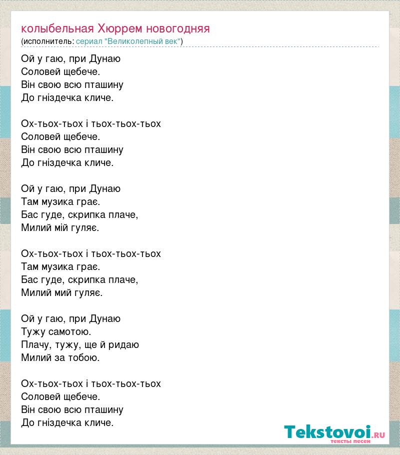 Ой у гаю, при Дунаю Соловей щебече. Він свою всю пташину До гніздечка кличе. Ох-тьох-тьох і тьох-тьох-тьох Соловей щебече. Він свою всю пташину До гніздечка кличе. Ой у гаю, при Дунаю Там музика грає. Бас гуде, скрипка плаче, Милий мій гуляє. Ох-тьох-тьох і тьох-тьох-тьох Там музика грає. Бас гуде, скрипка плаче, Милий мий гуляє. Ой у гаю, при Дунаю Тужу самотою. Плачу, тужу, ще й ридаю Милий за тобою. Ох-тьох-тьох і тьох-тьох-тьох Соловей щебече. Він свою всю пташину До гніздечка кличе.