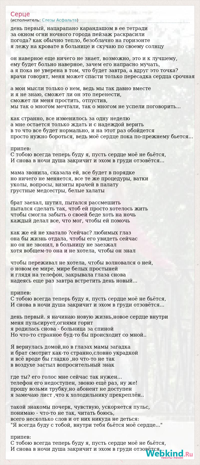 день первый, нацарапано карандашом в ее тетради за окном огни ночного города пейзаж раскрасили погода? как обычно тепло, безоблачно на горизонте я лежу на кровате в больнице и скучаю по своему солнцу он наверное еще ничего не знает, возможно, это и к лучшему, ему будет больно наверное, зачем его напрасно мучать, а я пока не уверена в том, что будет завтра, а вдруг это точка? врачи говорят, меня может спасти только пересадка сердца срочная а мои мысли только о нем, ведь мы так давно вместе и я не знаю, сможет ли он это перенести, сможет ли меня простить, отпустив, мы так о многом мечтали, так о многом не успели поговорить... как странно, все изменилось за одну неделю а мне остается только ждать и с надеждой верить в то что все будет нормально, и на этот раз обойдется просто нужно бороться, ведь моё сердце пока по-прежнему бьется... припев: С тобою всегда теперь буду я, пусть сердце моё не бьётся, И снова в ночи душа закричит и эхом в груди отзовётся... мама звонила, сказала ей, все будет в порядке но ничего не меняется, все те же процедуры, ватки уколы, вопросы, визиты врачей в палату грустные медсестры, белые халаты брат заехал, шутил, пытался рассмешить пытался сделать так, чтоб ей просто хотелось жить чтобы смогла забыть о своей беде хоть на ночь каждый делал все, что мог, чтобы ей помочь как же ей не хватало ?сейчас? любимых глаз она бы жизнь отдала, чтобы его увидеть сейчас но он не звонил, в больницу не заезжал хотя вобщем-то она и не хотела, чтобы он знал чтобы переживал не хотела, чтобы волновался о ней, о новом ее мире, мире белых простыней и глядя на телефон, закрывала глаза снова надеясь еще раз завтра встретить день новый... припев: С тобою всегда теперь буду я, пусть сердце моё не бьётся, И снова в ночи душа закричит и эхом в груди отзовётся... день первый. я начинаю новую жизнь,новое сердце внутри меня пульсирует,огнями горит я родилась снова - больница за спиной Но что-то странное буд-то бы происходит со мной.. Я вернулась домой,но в глазах мамы загадка и брат смотрит как-то странно,словно украдкой и всё вроде бы гладко ,но что-то не так в воздухе застыл вопросительный знак где ты? его голос мне сейчас так нужен... телефон его недоступен, звоню ещё раз, ну же! прошу возьми трубку,но абонент не доступен я замечаю лист ,что к холодильнику прекреплён.. такой знакомы почерк, чувствую, ускоряется пульс, понимаю - что-то не так, читать боюсь, всего несколько слов и от них никуда не деться: "Я всегда буду с тобой, внутри тебя бьётся моё сердце..." припев: С тобою всегда теперь буду я, пусть сердце моё не бьётся, И снова в ночи душа закричит и эхом в груди отзовётся...