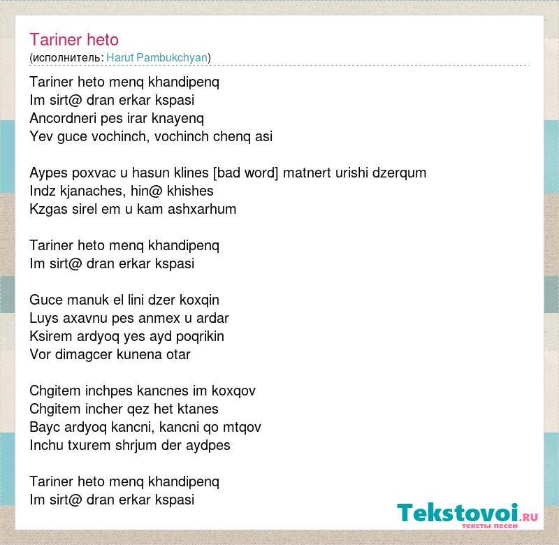 Tariner heto menq khandipenq Im sirt@ dran erkar kspasi Ancordneri pes irar knayenq Yev guce vochinch, vochinch chenq asi Aypes poxvac u hasun klines Sirun matnert urishi dzerqum Indz kjanaches, hin@ khishes Kzgas sirel em u kam ashxarhum Tariner heto menq khandipenq Im sirt@ dran erkar kspasi Guce manuk el lini dzer koxqin Luys axavnu pes anmex u ardar Ksirem ardyoq yes ayd poqrikin Vor dimagcer kunena otar Chgitem inchpes kancnes im koxqov Chgitem incher qez het ktanes Bayc ardyoq kancni, kancni qo mtqov Inchu txurem shrjum der aydpes Tariner heto menq khandipenq Im sirt@ dran erkar kspasi