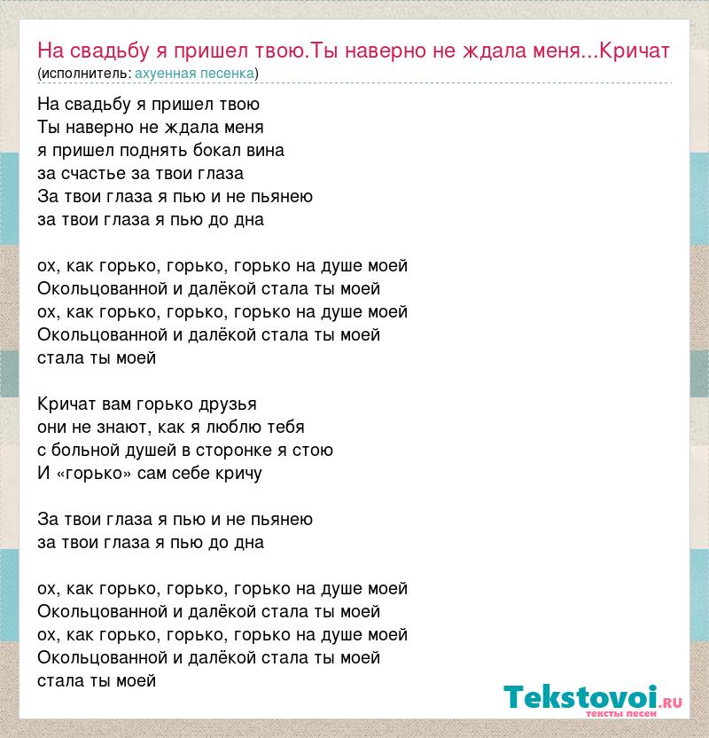 На свадьбу я пришел твою Ты наверно не ждала меня я пришел поднять бокал вина за счастье за твои глаза За твои глаза я пью и не пьянею за твои глаза я пью до дна ох, как горько, горько, горько на душе моей Окольцованной и далёкой стала ты моей ох, как горько, горько, горько на душе моей Окольцованной и далёкой стала ты моей стала ты моей Кричат вам горько друзья они не знают, как я люблю тебя с больной душей в сторонке я стою И «горько» сам себе кричу За твои глаза я пью и не пьянею за твои глаза я пью до дна ох, как горько, горько, горько на душе моей Окольцованной и далёкой стала ты моей ох, как горько, горько, горько на душе моей Окольцованной и далёкой стала ты моей стала ты моей