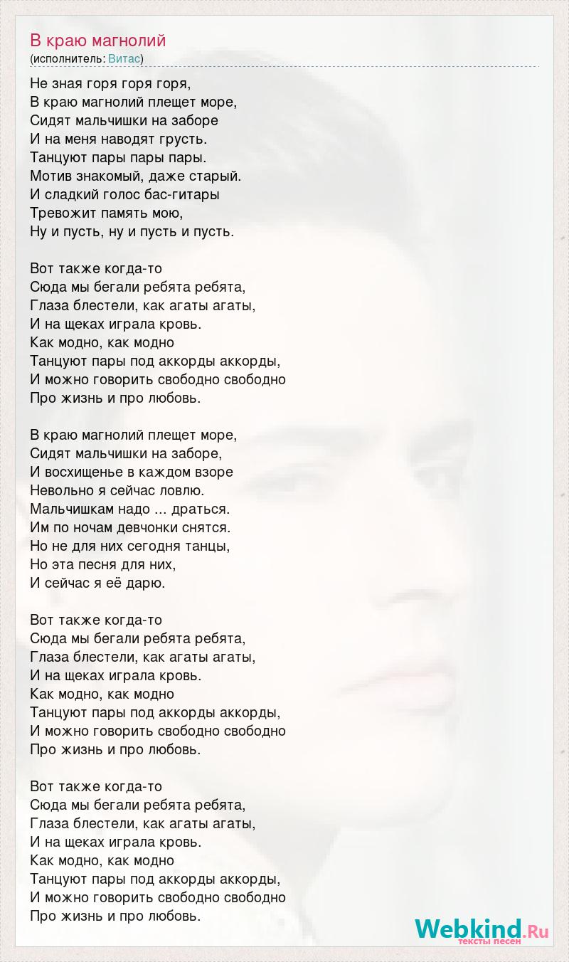 Не зная горя горя горя, В краю магнолий плещет море, Сидят мальчишки на заборе И на меня наводят грусть. Танцуют пары пары пары. Мотив знакомый, даже старый. И сладкий голос бас-гитары Тревожит память мою, Ну и пусть, ну и пусть и пусть. Вот также когда-то Сюда мы бегали ребята ребята, Глаза блестели, как агаты агаты, И на щеках играла кровь. Как модно, как модно Танцуют пары под аккорды аккорды, И можно говорить свободно свободно Про жизнь и про любовь. В краю магнолий плещет море, Сидят мальчишки на заборе, И восхищенье в каждом взоре Невольно я сейчас ловлю. Мальчишкам надо ... драться. Им по ночам девчонки снятся. Но не для них сегодня танцы, Но эта песня для них, И сейчас я её дарю. Вот также когда-то Сюда мы бегали ребята ребята, Глаза блестели, как агаты агаты, И на щеках играла кровь. Как модно, как модно Танцуют пары под аккорды аккорды, И можно говорить свободно свободно Про жизнь и про любовь. Вот также когда-то Сюда мы бегали ребята ребята, Глаза блестели, как агаты агаты, И на щеках играла кровь. Как модно, как модно Танцуют пары под аккорды аккорды, И можно говорить свободно свободно Про жизнь и про любовь.