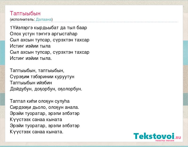 1Yйэлэргэ кырдьыбат да тыл баар Олох устун тэҥҥэ аргыстаhар Сыл ахсын тупсар, сүрэхтэн тахсар Истиҥ иэйии тыла Сыл ахсын тупсар, сүрэхтэн тахсар Истиҥ иэйии тыла. Таптыыбын, таптыыбын, Сүрэҕим тэбэринии куруутун Таптыыбын ийэбин Дойдубун, доҕорбун, оҕолорбун. Таптал киhи олоҕун сулуhа Сирдээҕи дьоло, олоҕун анала. Эрэйи туоратар, эрэли элбэтэр Күүстээх санаа кыната Эрэйи туоратар, эрэли элбэтэр Күүстээх санаа кыната.