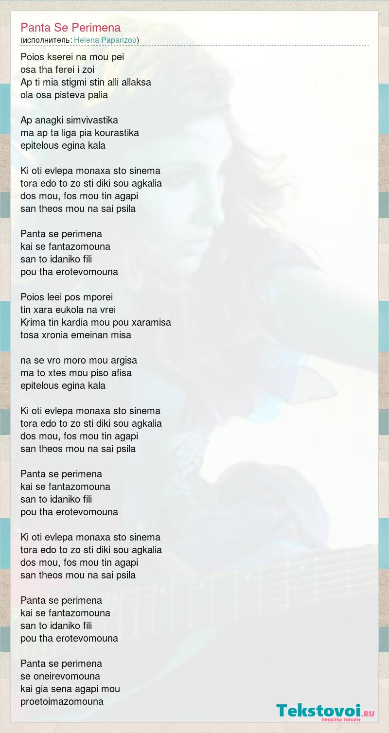 Poios kserei na mou pei osa tha ferei i zoi Ap ti mia stigmi stin alli allaksa ola osa pisteva palia Ap anagki simvivastika ma ap ta liga pia kourastika epitelous egina kala Ki oti evlepa monaxa sto sinema tora edo to zo sti diki sou agkalia dos mou, fos mou tin agapi san theos mou na sai psila Panta se perimena kai se fantazomouna san to idaniko fili pou tha erotevomouna Poios leei pos mporei tin xara eukola na vrei Krima tin kardia mou pou xaramisa tosa xronia emeinan misa na se vro moro mou argisa ma to xtes mou piso afisa epitelous egina kala Ki oti evlepa monaxa sto sinema tora edo to zo sti diki sou agkalia dos mou, fos mou tin agapi san theos mou na sai psila Panta se perimena kai se fantazomouna san to idaniko fili pou tha erotevomouna Ki oti evlepa monaxa sto sinema tora edo to zo sti diki sou agkalia dos mou, fos mou tin agapi san theos mou na sai psila Panta se perimena kai se fantazomouna san to idaniko fili pou tha erotevomouna Panta se perimena se oneirevomouna kai gia sena agapi mou proetoimazomouna