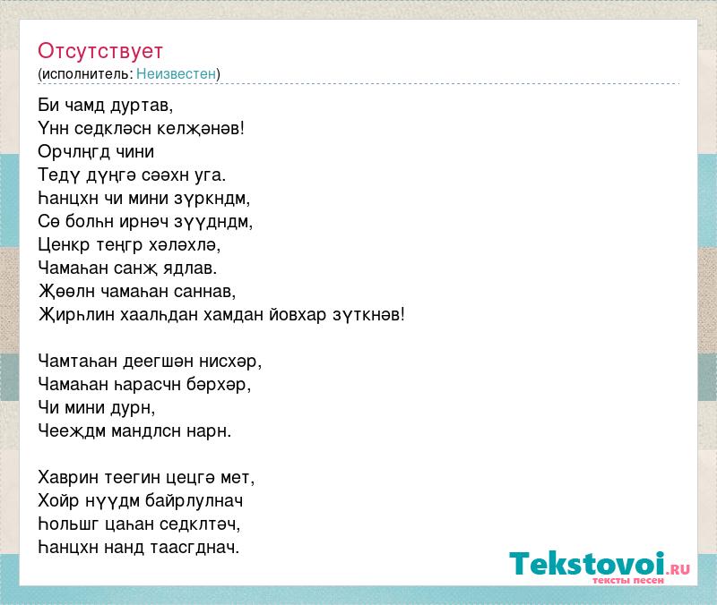 Би чамд дуртав, Үнн седкләсн келҗәнәв! Орчлңгд чини Тедү дүңгә сәәхн уга. Һанцхн чи мини зүркндм, Сө болһн ирнәч зүүдндм, Ценкр теңгр хәләхлә, Чамаһан санҗ ядлав. Җөөлн чамаһан саннав, Җирһлин хаалһдан хамдан йовхар зүткнәв! Чамтаһан деегшән нисхәр, Чамаһан һарасчн бәрхәр, Чи мини дурн, Чееҗдм мандлсн нарн. Хаврин теегин цецгә мет, Хойр нүүдм байрлулнач Һольшг цаһан седклтәч, Һанцхн нанд таасгднач.