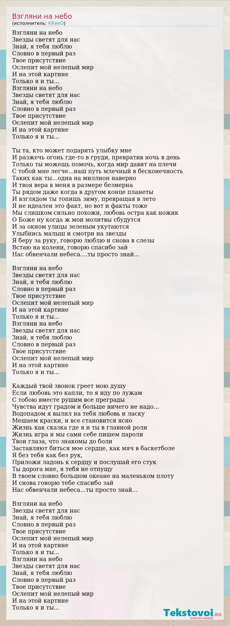 Взгляни на небо Звезды светят для нас Знай, я тебя люблю Словно в первый раз Твое присутствие Ослепит мой нелепый мир И на этой картине Только я и ты... Взгляни на небо Звезды светят для нас Знай, я тебя люблю Словно в первый раз Твое присутствие Ослепит мой нелепый мир И на этой картине Только я и ты... Ты та, кто может подарить улыбку мне И разжечь огонь где-то в груди, превратив ночь в день Только ты можешь помочь, когда мир давит на плечи С тобой мне легче...наш путь млечный в бесконечность Таких как ты…одна на миллион наверно И твоя вера в меня в размере безмерна Ты рядом даже когда в другом конце планеты И взглядом ты топишь зиму, превращая в лето Я не идеален это факт, но вот и факты тоже Мы слишком сильно похожи, любовь остра как ножик О Боже ну когда ж мои молитвы сбудутся И за окном улицы зеленым укутаются Улыбнись малыш и смотри на звезды Я беру за руку, говорю люблю и снова в слезы Встаю на колени, говорю спасибо зай Нас обвенчали небеса....ты просто знай... Взгляни на небо Звезды светят для нас Знай, я тебя люблю Словно в первый раз Твое присутствие Ослепит мой нелепый мир И на этой картине Только я и ты... Взгляни на небо Звезды светят для нас Знай, я тебя люблю Словно в первый раз Твое присутствие Ослепит мой нелепый мир И на этой картине Только я и ты... Каждый твой звонок греет мою душу Если любовь это капли, то я иду по лужам С тобою вместе рушим все преграды Чувства идут градом и больше ничего не надо... Водопадом я вылил на тебя любовь и ласку Мешаем краски, и все становится ясно Жизнь как сказка где я и ты в главной роли Жизнь игра и мы сами себе пишем пароли Твои глаза, что знакомы до боли Заставляют биться мое сердце, как мяч в баскетболе Я без тебя как без рук, Приложи ладонь к сердцу и послушай его стук Ты дорога мне, я тебя не отпущу В твоем словно большом океане на маленьком плоту И снова говорю тебе спасибо зай Нас обвенчали небеса...ты просто знай... Взгляни на небо Звезды светят для нас Знай, я тебя люблю Словно в первый раз Твое присутствие Ослепит мой нелепый мир И на этой картине Только я и ты... Взгляни на небо Звезды светят для нас Знай, я тебя люблю Словно в первый раз Твое присутствие Ослепит мой нелепый мир И на этой картине Только я и ты...