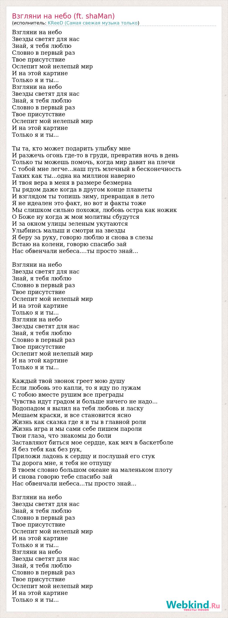 Взгляни на небо Звезды светят для нас Знай, я тебя люблю Словно в первый раз Твое присутствие Ослепит мой нелепый мир И на этой картине Только я и ты... Взгляни на небо Звезды светят для нас Знай, я тебя люблю Словно в первый раз Твое присутствие Ослепит мой нелепый мир И на этой картине Только я и ты... Ты та, кто может подарить улыбку мне И разжечь огонь где-то в груди, превратив ночь в день Только ты можешь помочь, когда мир давит на плечи С тобой мне легче...наш путь млечный в бесконечность Таких как ты…одна на миллион наверно И твоя вера в меня в размере безмерна Ты рядом даже когда в другом конце планеты И взглядом ты топишь зиму, превращая в лето Я не идеален это факт, но вот и факты тоже Мы слишком сильно похожи, любовь остра как ножик О Боже ну когда ж мои молитвы сбудутся И за окном улицы зеленым укутаются Улыбнись малыш и смотри на звезды Я беру за руку, говорю люблю и снова в слезы Встаю на колени, говорю спасибо зай Нас обвенчали небеса....ты просто знай... Взгляни на небо Звезды светят для нас Знай, я тебя люблю Словно в первый раз Твое присутствие Ослепит мой нелепый мир И на этой картине Только я и ты... Взгляни на небо Звезды светят для нас Знай, я тебя люблю Словно в первый раз Твое присутствие Ослепит мой нелепый мир И на этой картине Только я и ты... Каждый твой звонок греет мою душу Если любовь это капли, то я иду по лужам С тобою вместе рушим все преграды Чувства идут градом и больше ничего не надо... Водопадом я вылил на тебя любовь и ласку Мешаем краски, и все становится ясно Жизнь как сказка где я и ты в главной роли Жизнь игра и мы сами себе пишем пароли Твои глаза, что знакомы до боли Заставляют биться мое сердце, как мяч в баскетболе Я без тебя как без рук, Приложи ладонь к сердцу и послушай его стук Ты дорога мне, я тебя не отпущу В твоем словно большом океане на маленьком плоту И снова говорю тебе спасибо зай Нас обвенчали небеса...ты просто знай... Взгляни на небо Звезды светят для нас Знай, я тебя люблю Словно в первый раз Твое присутствие Ослепит мой нелепый мир И на этой картине Только я и ты... Взгляни на небо Звезды светят для нас Знай, я тебя люблю Словно в первый раз Твое присутствие Ослепит мой нелепый мир И на этой картине Только я и ты...