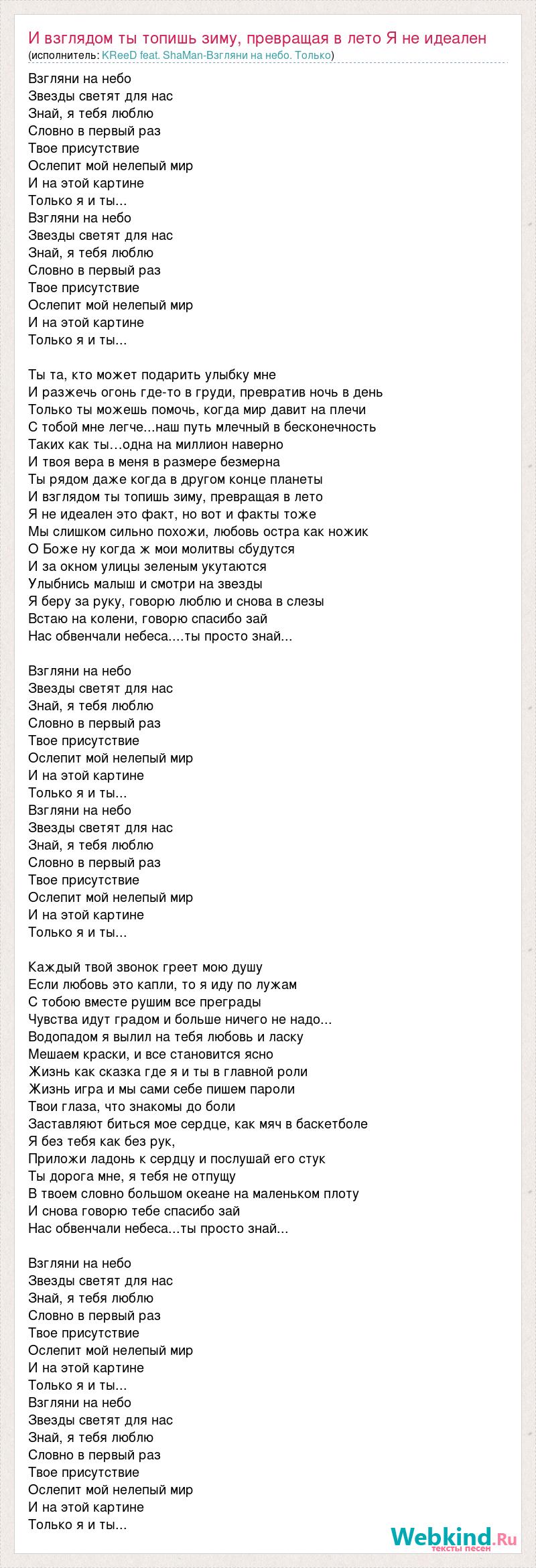 Главная→Исполнители→KReeD feat. ShaMan-Взгляни на небо. Только ты можешь помочь, когда мир давит на плечи..Таких как ты…одна на миллион наверно..→И взглядом ты топишь зиму, превращая в лето Я не идеален это факт, но вот