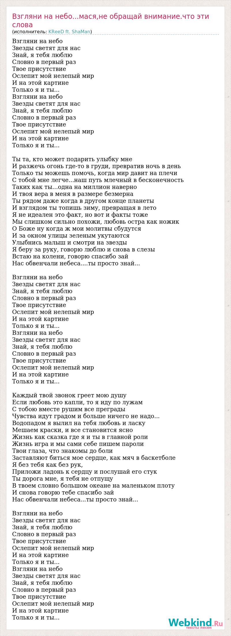 Взгляни на небо Звезды светят для нас Знай, я тебя люблю Словно в первый раз Твое присутствие Ослепит мой нелепый мир И на этой картине Только я и ты... Взгляни на небо Звезды светят для нас Знай, я тебя люблю Словно в первый раз Твое присутствие Ослепит мой нелепый мир И на этой картине Только я и ты... Ты та, кто может подарить улыбку мне И разжечь огонь где-то в груди, превратив ночь в день Только ты можешь помочь, когда мир давит на плечи С тобой мне легче...наш путь млечный в бесконечность Таких как ты…одна на миллион наверно И твоя вера в меня в размере безмерна Ты рядом даже когда в другом конце планеты И взглядом ты топишь зиму, превращая в лето Я не идеален это факт, но вот и факты тоже Мы слишком сильно похожи, любовь остра как ножик О Боже ну когда ж мои молитвы сбудутся И за окном улицы зеленым укутаются Улыбнись малыш и смотри на звезды Я беру за руку, говорю люблю и снова в слезы Встаю на колени, говорю спасибо зай Нас обвенчали небеса....ты просто знай... Взгляни на небо Звезды светят для нас Знай, я тебя люблю Словно в первый раз Твое присутствие Ослепит мой нелепый мир И на этой картине Только я и ты... Взгляни на небо Звезды светят для нас Знай, я тебя люблю Словно в первый раз Твое присутствие Ослепит мой нелепый мир И на этой картине Только я и ты... Каждый твой звонок греет мою душу Если любовь это капли, то я иду по лужам С тобою вместе рушим все преграды Чувства идут градом и больше ничего не надо... Водопадом я вылил на тебя любовь и ласку Мешаем краски, и все становится ясно Жизнь как сказка где я и ты в главной роли Жизнь игра и мы сами себе пишем пароли Твои глаза, что знакомы до боли Заставляют биться мое сердце, как мяч в баскетболе Я без тебя как без рук, Приложи ладонь к сердцу и послушай его стук Ты дорога мне, я тебя не отпущу В твоем словно большом океане на маленьком плоту И снова говорю тебе спасибо зай Нас обвенчали небеса...ты просто знай... Взгляни на небо Звезды светят для нас Знай, я тебя люблю Словно в первый раз Твое присутствие Ослепит мой нелепый мир И на этой картине Только я и ты... Взгляни на небо Звезды светят для нас Знай, я тебя люблю Словно в первый раз Твое присутствие Ослепит мой нелепый мир И на этой картине Только я и ты...