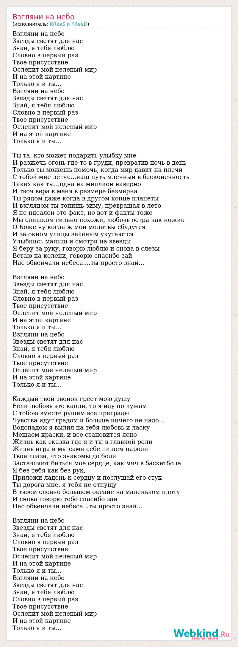 Взгляни на небо Звезды светят для нас Знай, я тебя люблю Словно в первый раз Твое присутствие Ослепит мой нелепый мир И на этой картине Только я и ты... Взгляни на небо Звезды светят для нас Знай, я тебя люблю Словно в первый раз Твое присутствие Ослепит мой нелепый мир И на этой картине Только я и ты... Ты та, кто может подарить улыбку мне И разжечь огонь где-то в груди, превратив ночь в день Только ты можешь помочь, когда мир давит на плечи С тобой мне легче...наш путь млечный в бесконечность Таких как ты…одна на миллион наверно И твоя вера в меня в размере безмерна Ты рядом даже когда в другом конце планеты И взглядом ты топишь зиму, превращая в лето Я не идеален это факт, но вот и факты тоже Мы слишком сильно похожи, любовь остра как ножик О Боже ну когда ж мои молитвы сбудутся И за окном улицы зеленым укутаются Улыбнись малыш и смотри на звезды Я беру за руку, говорю люблю и снова в слезы Встаю на колени, говорю спасибо зай Нас обвенчали небеса....ты просто знай... Взгляни на небо Звезды светят для нас Знай, я тебя люблю Словно в первый раз Твое присутствие Ослепит мой нелепый мир И на этой картине Только я и ты... Взгляни на небо Звезды светят для нас Знай, я тебя люблю Словно в первый раз Твое присутствие Ослепит мой нелепый мир И на этой картине Только я и ты... Каждый твой звонок греет мою душу Если любовь это капли, то я иду по лужам С тобою вместе рушим все преграды Чувства идут градом и больше ничего не надо... Водопадом я вылил на тебя любовь и ласку Мешаем краски, и все становится ясно Жизнь как сказка где я и ты в главной роли Жизнь игра и мы сами себе пишем пароли Твои глаза, что знакомы до боли Заставляют биться мое сердце, как мяч в баскетболе Я без тебя как без рук, Приложи ладонь к сердцу и послушай его стук Ты дорога мне, я тебя не отпущу В твоем словно большом океане на маленьком плоту И снова говорю тебе спасибо зай Нас обвенчали небеса...ты просто знай... Взгляни на небо Звезды светят для нас Знай, я тебя люблю Словно в первый раз Твое присутствие Ослепит мой нелепый мир И на этой картине Только я и ты... Взгляни на небо Звезды светят для нас Знай, я тебя люблю Словно в первый раз Твое присутствие Ослепит мой нелепый мир И на этой картине Только я и ты...