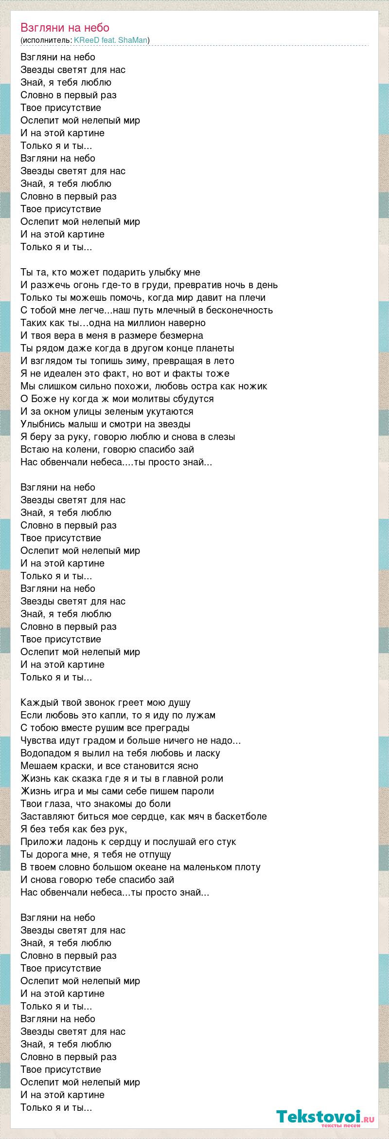 Взгляни на небо Звезды светят для нас Знай, я тебя люблю Словно в первый раз Твое присутствие Ослепит мой нелепый мир И на этой картине Только я и ты... Взгляни на небо Звезды светят для нас Знай, я тебя люблю Словно в первый раз Твое присутствие Ослепит мой нелепый мир И на этой картине Только я и ты... Ты та, кто может подарить улыбку мне И разжечь огонь где-то в груди, превратив ночь в день Только ты можешь помочь, когда мир давит на плечи С тобой мне легче...наш путь млечный в бесконечность Таких как ты…одна на миллион наверно И твоя вера в меня в размере безмерна Ты рядом даже когда в другом конце планеты И взглядом ты топишь зиму, превращая в лето Я не идеален это факт, но вот и факты тоже Мы слишком сильно похожи, любовь остра как ножик О Боже ну когда ж мои молитвы сбудутся И за окном улицы зеленым укутаются Улыбнись малыш и смотри на звезды Я беру за руку, говорю люблю и снова в слезы Встаю на колени, говорю спасибо зай Нас обвенчали небеса....ты просто знай... Взгляни на небо Звезды светят для нас Знай, я тебя люблю Словно в первый раз Твое присутствие Ослепит мой нелепый мир И на этой картине Только я и ты... Взгляни на небо Звезды светят для нас Знай, я тебя люблю Словно в первый раз Твое присутствие Ослепит мой нелепый мир И на этой картине Только я и ты... Каждый твой звонок греет мою душу Если любовь это капли, то я иду по лужам С тобою вместе рушим все преграды Чувства идут градом и больше ничего не надо... Водопадом я вылил на тебя любовь и ласку Мешаем краски, и все становится ясно Жизнь как сказка где я и ты в главной роли Жизнь игра и мы сами себе пишем пароли Твои глаза, что знакомы до боли Заставляют биться мое сердце, как мяч в баскетболе Я без тебя как без рук, Приложи ладонь к сердцу и послушай его стук Ты дорога мне, я тебя не отпущу В твоем словно большом океане на маленьком плоту И снова говорю тебе спасибо зай Нас обвенчали небеса...ты просто знай... Взгляни на небо Звезды светят для нас Знай, я тебя люблю Словно в первый раз Твое присутствие Ослепит мой нелепый мир И на этой картине Только я и ты... Взгляни на небо Звезды светят для нас Знай, я тебя люблю Словно в первый раз Твое присутствие Ослепит мой нелепый мир И на этой картине Только я и ты...