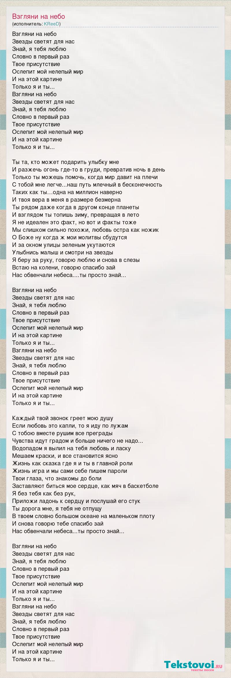 Взгляни на небо Звезды светят для нас Знай, я тебя люблю Словно в первый раз Твое присутствие Ослепит мой нелепый мир И на этой картине Только я и ты... Взгляни на небо Звезды светят для нас Знай, я тебя люблю Словно в первый раз Твое присутствие Ослепит мой нелепый мир И на этой картине Только я и ты... Ты та, кто может подарить улыбку мне И разжечь огонь где-то в груди, превратив ночь в день Только ты можешь помочь, когда мир давит на плечи С тобой мне легче...наш путь млечный в бесконечность Таких как ты…одна на миллион наверно И твоя вера в меня в размере безмерна Ты рядом даже когда в другом конце планеты И взглядом ты топишь зиму, превращая в лето Я не идеален это факт, но вот и факты тоже Мы слишком сильно похожи, любовь остра как ножик О Боже ну когда ж мои молитвы сбудутся И за окном улицы зеленым укутаются Улыбнись малыш и смотри на звезды Я беру за руку, говорю люблю и снова в слезы Встаю на колени, говорю спасибо зай Нас обвенчали небеса....ты просто знай... Взгляни на небо Звезды светят для нас Знай, я тебя люблю Словно в первый раз Твое присутствие Ослепит мой нелепый мир И на этой картине Только я и ты... Взгляни на небо Звезды светят для нас Знай, я тебя люблю Словно в первый раз Твое присутствие Ослепит мой нелепый мир И на этой картине Только я и ты... Каждый твой звонок греет мою душу Если любовь это капли, то я иду по лужам С тобою вместе рушим все преграды Чувства идут градом и больше ничего не надо... Водопадом я вылил на тебя любовь и ласку Мешаем краски, и все становится ясно Жизнь как сказка где я и ты в главной роли Жизнь игра и мы сами себе пишем пароли Твои глаза, что знакомы до боли Заставляют биться мое сердце, как мяч в баскетболе Я без тебя как без рук, Приложи ладонь к сердцу и послушай его стук Ты дорога мне, я тебя не отпущу В твоем словно большом океане на маленьком плоту И снова говорю тебе спасибо зай Нас обвенчали небеса...ты просто знай... Взгляни на небо Звезды светят для нас Знай, я тебя люблю Словно в первый раз Твое присутствие Ослепит мой нелепый мир И на этой картине Только я и ты... Взгляни на небо Звезды светят для нас Знай, я тебя люблю Словно в первый раз Твое присутствие Ослепит мой нелепый мир И на этой картине Только я и ты...