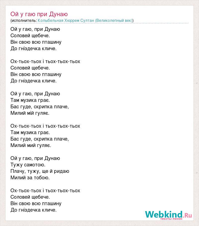 Ой у гаю, при Дунаю Соловей щебече. Він свою всю пташину До гніздечка кличе. Ох-тьох-тьох і тьох-тьох-тьох Соловей щебече. Він свою всю пташину До гніздечка кличе. Ой у гаю, при Дунаю Там музика грає. Бас гуде, скрипка плаче, Милий мій гуляє. Ох-тьох-тьох і тьох-тьох-тьох Там музика грає. Бас гуде, скрипка плаче, Милий мий гуляє. Ой у гаю, при Дунаю Тужу самотою. Плачу, тужу, ще й ридаю Милий за тобою. Ох-тьох-тьох і тьох-тьох-тьох Соловей щебече. Він свою всю пташину До гніздечка кличе.