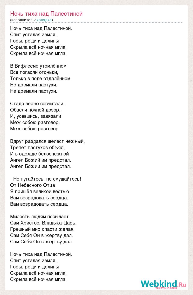 Ночь тиха над Палестиной. Спит усталая земля. Горы, рощи и долины Скрыла всё ночная мгла. Скрыла всё ночная мгла. В Вифлееме утомлённом Все погасли огоньки, Только в поле отдалённом Не дремали пастухи. Не дремали пастухи. Стадо верно сосчитали, Обвели ночной дозор, И, усевшись, завязали Меж собою разговор. Меж собою разговор. Вдруг раздался шелест нежный, Трепет пастухов объял, И в одежде белоснежной Ангел Божий им предстал. Ангел Божий им предстал. - Не пугайтесь, не смущайтесь! От Небесного Отца Я пришёл великой вестью Вам возрадовать сердца. Вам возрадовать сердца. Милость людям посылает Сам Христос, Владыка-Царь. Грешный мир спасти желая, Сам Себя Он в жертву дал. Сам Себя Он в жертву дал. Ночь тиха над Палестиной. Спит усталая земля. Горы, рощи и долины Скрыла всё ночная мгла. Скрыла всё ночная мгла.
