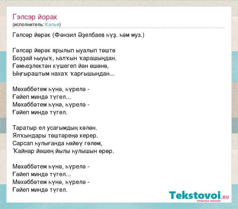 Гәлсәр йөрәк (Фәнзил Әҙелбаев һүҙ. һәм муз.) Гәлсәр йөрәк ярылып ыуалып төштө Боҙҙай һыуыҡ, һалҡын ҡарашыңдан. Ғәмһеҙлектән күшегеп йән өшөнө, Ыңғыраштым нахаҡ ҡарғышыңдан... Мөхәббәтем һүнә, һүрелә - Ғәйеп миндә түгел... Мөхәббәтем һүнә, һүрелә - Ғәйеп миндә түгел. Таратыр ел усағымдың көлөн. Ялҡындары төштәреңә керер. Сарсап һулығанда һөйөү гөлөм, Ҡайнар йәшең йылы һулышын өрөр. Мөхәббәтем һүнә, һүрелә - Ғәйеп миндә түгел... Мөхәббәтем һүнә, һүрелә - Ғәйеп миндә түгел.