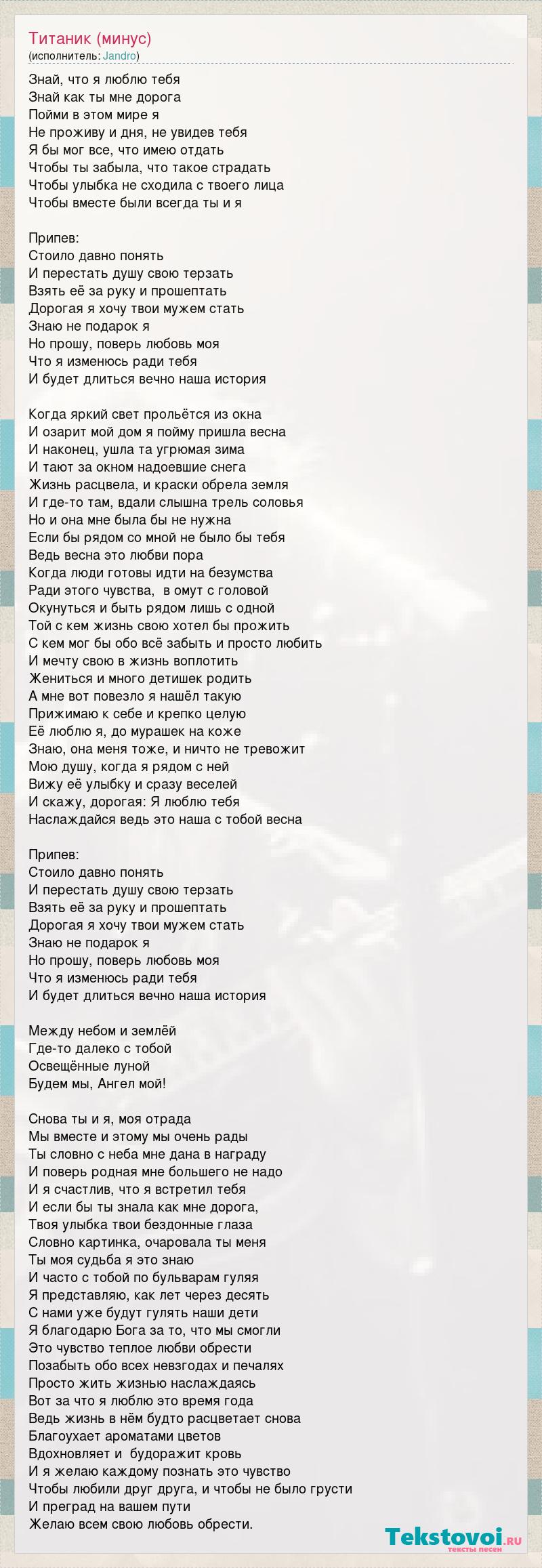 Знай, что я люблю тебя Знай как ты мне дорога Пойми в этом мире я Не проживу и дня, не увидев тебя Я бы мог все, что имею отдать Чтобы ты забыла, что такое страдать Чтобы улыбка не сходила с твоего лица Чтобы вместе были всегда ты и я Припев: Стоило давно понять И перестать душу свою терзать Взять её за руку и прошептать Дорогая я хочу твои мужем стать Знаю не подарок я Но прошу, поверь любовь моя Что я изменюсь ради тебя И будет длиться вечно наша история Когда яркий свет прольётся из окна И озарит мой дом я пойму пришла весна И наконец, ушла та угрюмая зима И тают за окном надоевшие снега Жизнь расцвела, и краски обрела земля И где-то там, вдали слышна трель соловья Но и она мне была бы не нужна Если бы рядом со мной не было бы тебя Ведь весна это любви пора Когда люди готовы идти на безумства Ради этого чувства, в омут с головой Окунуться и быть рядом лишь с одной Той с кем жизнь свою хотел бы прожить С кем мог бы обо всё забыть и просто любить И мечту свою в жизнь воплотить Жениться и много детишек родить А мне вот повезло я нашёл такую Прижимаю к себе и крепко целую Её люблю я, до мурашек на коже Знаю, она меня тоже, и ничто не тревожит Мою душу, когда я рядом с ней Вижу её улыбку и сразу веселей И скажу, дорогая: Я люблю тебя Наслаждайся ведь это наша с тобой весна Припев: Стоило давно понять И перестать душу свою терзать Взять её за руку и прошептать Дорогая я хочу твои мужем стать Знаю не подарок я Но прошу, поверь любовь моя Что я изменюсь ради тебя И будет длиться вечно наша история Между небом и землёй Где-то далеко с тобой Освещённые луной Будем мы, Ангел мой! Снова ты и я, моя отрада Мы вместе и этому мы очень рады Ты словно с неба мне дана в награду И поверь родная мне большего не надо И я счастлив, что я встретил тебя И если бы ты знала как мне дорога, Твоя улыбка твои бездонные глаза Словно картинка, очаровала ты меня Ты моя судьба я это знаю И часто с тобой по бульварам гуляя Я представляю, как лет через десять С нами уже будут гулять наши дети Я благодарю Бога за то, что мы смогли Это чувство теплое любви обрести Позабыть обо всех невзгодах и печалях Просто жить жизнью наслаждаясь Вот за что я люблю это время года Ведь жизнь в нём будто расцветает снова Благоухает ароматами цветов Вдохновляет и будоражит кровь И я желаю каждому познать это чувство Чтобы любили друг друга, и чтобы не было грусти И преград на вашем пути Желаю всем свою любовь обрести.