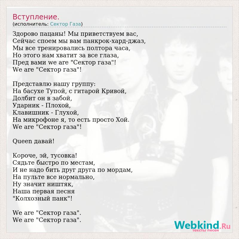 Здорово пацаны! Мы приветствуем вас, Сейчас споем мы вам панкрок-хард-джаз, Мы все тренировались полтора часа, Но этого нам хватит за все глаза, Пред вами we are "Сектор газа"! We are "Сектор газа"! Представлю нашу группу: На басухе Тупой, с гитарой Кривой, Долбит он в забой, Ударник - Плохой, Клавишник - Глухой, На микрофоне я, то есть просто Хой. We are "Сектор газа"! Queen давай! Короче, эй, тусовка! Сядьте быстро по местам, И не надо бить друг друга по мордам, На пульте все нормально, Ну значит ништяк, Наша первая песня "Колхозный панк"! We are "Сектор газа". We are "Сектор газа".