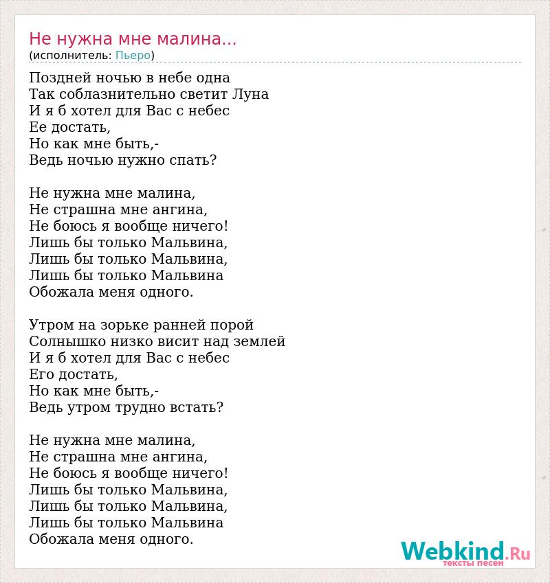 Поздней ночью в небе одна Так соблазнительно светит Луна И я б хотел для Вас с небес Ее достать, Но как мне быть,- Ведь ночью нужно спать? Не нужна мне малина, Не страшна мне ангина, Не боюсь я вообще ничего! Лишь бы только Мальвина, Лишь бы только Мальвина, Лишь бы только Мальвина Обожала меня одного. Утром на зорьке ранней порой Солнышко низко висит над землей И я б хотел для Вас с небес Его достать, Но как мне быть,- Ведь утром трудно встать? Не нужна мне малина, Не страшна мне ангина, Не боюсь я вообще ничего! Лишь бы только Мальвина, Лишь бы только Мальвина, Лишь бы только Мальвина Обожала меня одного.