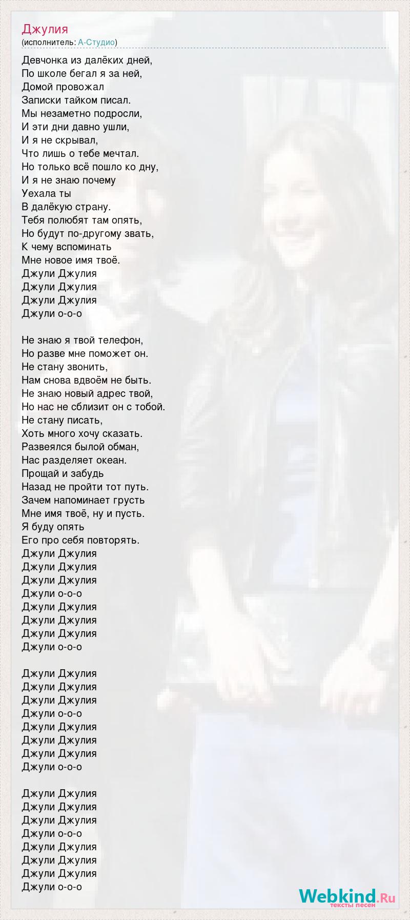 Девчонка из далёких дней, По школе бегал я за ней, Домой провожал Записки тайком писал. Мы незаметно подросли, И эти дни давно ушли, И я не скрывал, Что лишь о тебе мечтал. Но только всё пошло ко дну, И я не знаю почему Уехала ты В далёкую страну. Тебя полюбят там опять, Но будут по-другому звать, К чему вспоминать Мне новое имя твоё. Джули Джулия Джули Джулия Джули Джулия Джули о-о-о Не знаю я твой телефон, Но разве мне поможет он. Не стану звонить, Нам снова вдвоём не быть. Не знаю новый адрес твой, Но нас не сблизит он с тобой. Не стану писать, Хоть много хочу сказать. Развеялся былой обман, Нас разделяет океан. Прощай и забудь Назад не пройти тот путь. Зачем напоминает грусть Мне имя твоё, ну и пусть. Я буду опять Его про себя повторять. Джули Джулия Джули Джулия Джули Джулия Джули о-о-о Джули Джулия Джули Джулия Джули Джулия Джули о-о-о Джули Джулия Джули Джулия Джули Джулия Джули о-о-о Джули Джулия Джули Джулия Джули Джулия Джули о-о-о Джули Джулия Джули Джулия Джули Джулия Джули о-о-о Джули Джулия Джули Джулия Джули Джулия Джули о-о-о