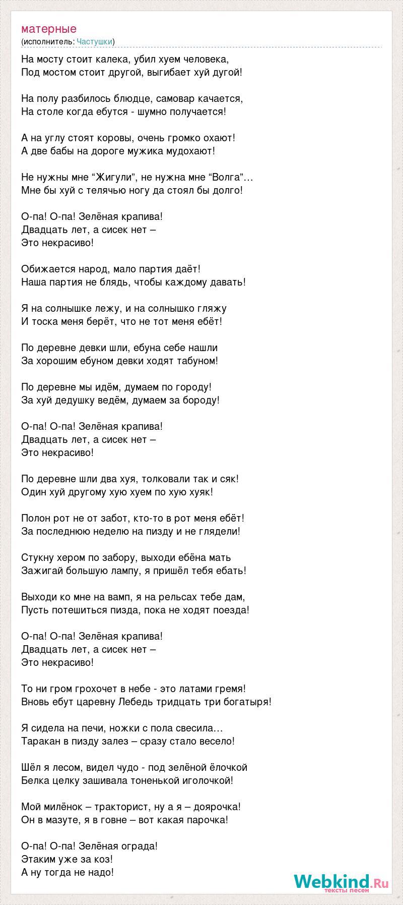 На мосту стоит калека, убил хуем человека, Под мостом стоит другой, выгибает хуй дугой! На полу разбилось блюдце, самовар качается, На столе когда ебутся - шумно получается! А на углу стоят коровы, очень громко охают! А две бабы на дороге мужика мудохают! Не нужны мне “Жигули”, не нужна мне “Волга”… Мне бы хуй с телячью ногу да стоял бы долго! О-па! О-па! Зелёная крапива! Двадцать лет, а сисек нет – Это некрасиво! Обижается народ, мало партия даёт! Наша партия не блядь, чтобы каждому давать! Я на солнышке лежу, и на солнышко гляжу И тоска меня берёт, что не тот меня ебёт! По деревне девки шли, ебуна себе нашли За хорошим ебуном девки ходят табуном! По деревне мы идём, думаем по городу! За хуй дедушку ведём, думаем за бороду! О-па! О-па! Зелёная крапива! Двадцать лет, а сисек нет – Это некрасиво! По деревне шли два хуя, толковали так и сяк! Один хуй другому хую хуем по хую хуяк! Полон рот не от забот, кто-то в рот меня ебёт! За последнюю неделю на пизду и не глядели! Стукну хером по забору, выходи ебёна мать Зажигай большую лампу, я пришёл тебя ебать! Выходи ко мне на вамп, я на рельсах тебе дам, Пусть потешиться пизда, пока не ходят поезда! О-па! О-па! Зелёная крапива! Двадцать лет, а сисек нет – Это некрасиво! То ни гром грохочет в небе - это латами гремя! Вновь ебут царевну Лебедь тридцать три богатыря! Я сидела на печи, ножки с пола свесила… Таракан в пизду залез – сразу стало весело! Шёл я лесом, видел чудо - под зелёной ёлочкой Белка целку зашивала тоненькой иголочкой! Мой милёнок – тракторист, ну а я – доярочка! Он в мазуте, я в говне – вот какая парочка! О-па! О-па! Зелёная ограда! Этаким уже за коз! А ну тогда не надо!