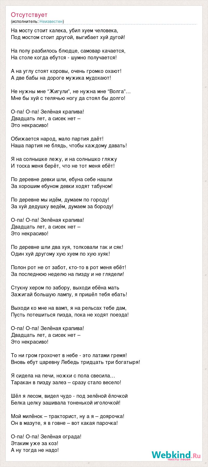 На мосту стоит калека, убил хуем человека, Под мостом стоит другой, выгибает хуй дугой! На полу разбилось блюдце, самовар качается, На столе когда ебутся - шумно получается! А на углу стоят коровы, очень громко охают! А две бабы на дороге мужика мудохают! Не нужны мне “Жигули”, не нужна мне “Волга”… Мне бы хуй с телячью ногу да стоял бы долго! О-па! О-па! Зелёная крапива! Двадцать лет, а сисек нет – Это некрасиво! Обижается народ, мало партия даёт! Наша партия не блядь, чтобы каждому давать! Я на солнышке лежу, и на солнышко гляжу И тоска меня берёт, что не тот меня ебёт! По деревне девки шли, ебуна себе нашли За хорошим ебуном девки ходят табуном! По деревне мы идём, думаем по городу! За хуй дедушку ведём, думаем за бороду! О-па! О-па! Зелёная крапива! Двадцать лет, а сисек нет – Это некрасиво! По деревне шли два хуя, толковали так и сяк! Один хуй другому хую хуем по хую хуяк! Полон рот не от забот, кто-то в рот меня ебёт! За последнюю неделю на пизду и не глядели! Стукну хером по забору, выходи ебёна мать Зажигай большую лампу, я пришёл тебя ебать! Выходи ко мне на вамп, я на рельсах тебе дам, Пусть потешиться пизда, пока не ходят поезда! О-па! О-па! Зелёная крапива! Двадцать лет, а сисек нет – Это некрасиво! То ни гром грохочет в небе - это латами гремя! Вновь ебут царевну Лебедь тридцать три богатыря! Я сидела на печи, ножки с пола свесила… Таракан в пизду залез – сразу стало весело! Шёл я лесом, видел чудо - под зелёной ёлочкой Белка целку зашивала тоненькой иголочкой! Мой милёнок – тракторист, ну а я – доярочка! Он в мазуте, я в говне – вот какая парочка! О-па! О-па! Зелёная ограда! Этаким уже за коз! А ну тогда не надо!